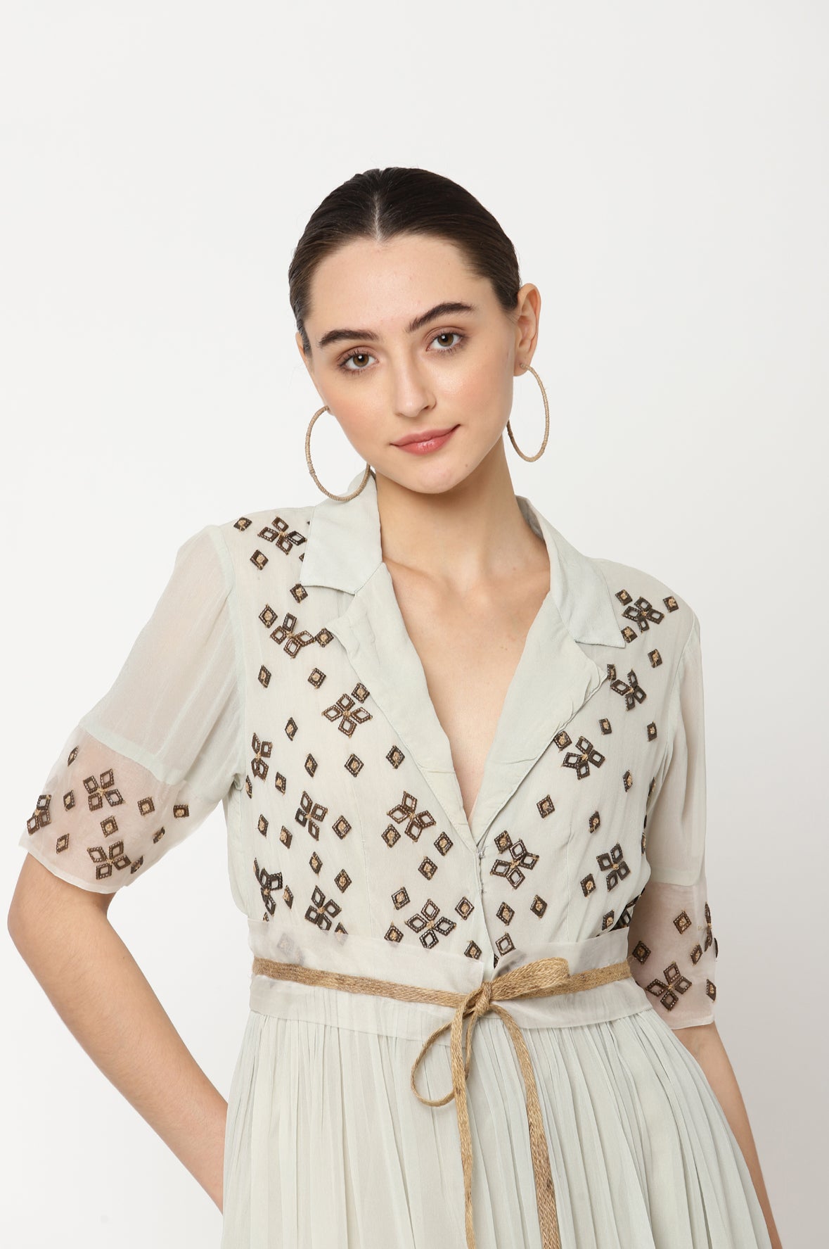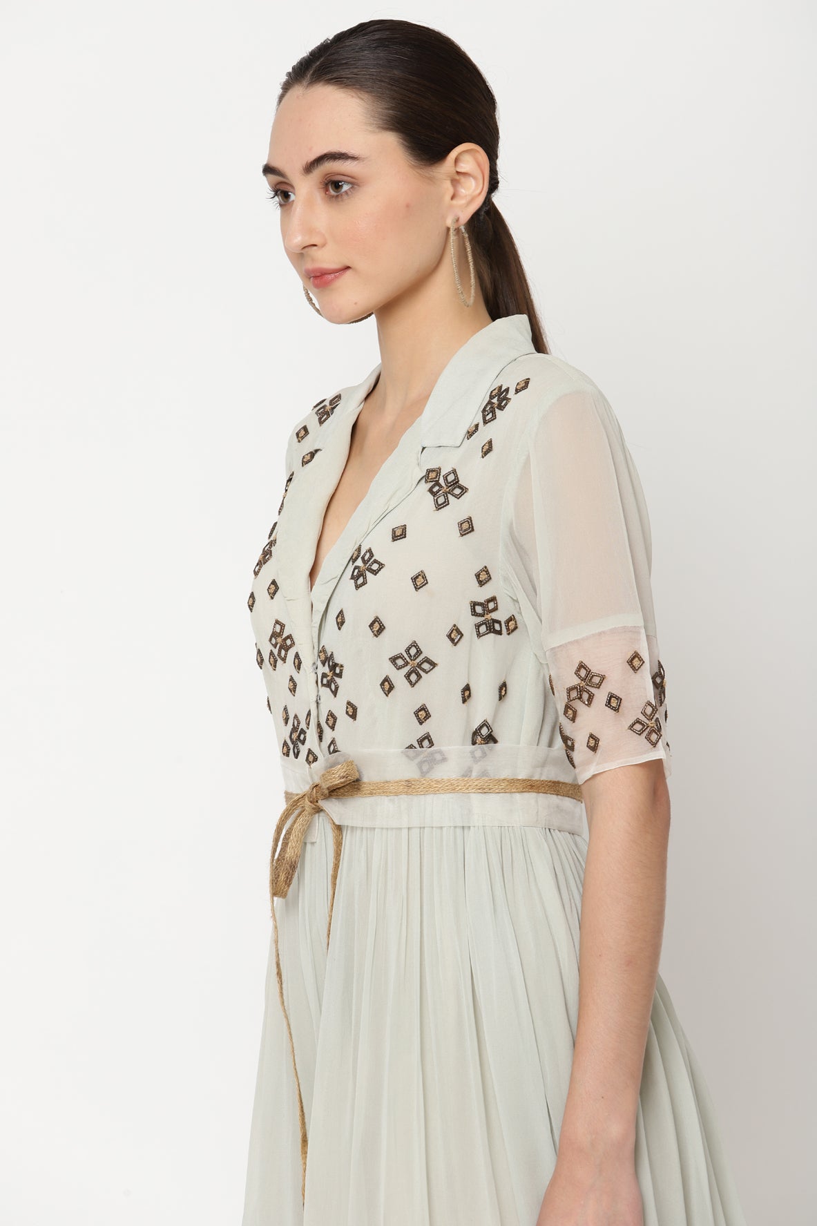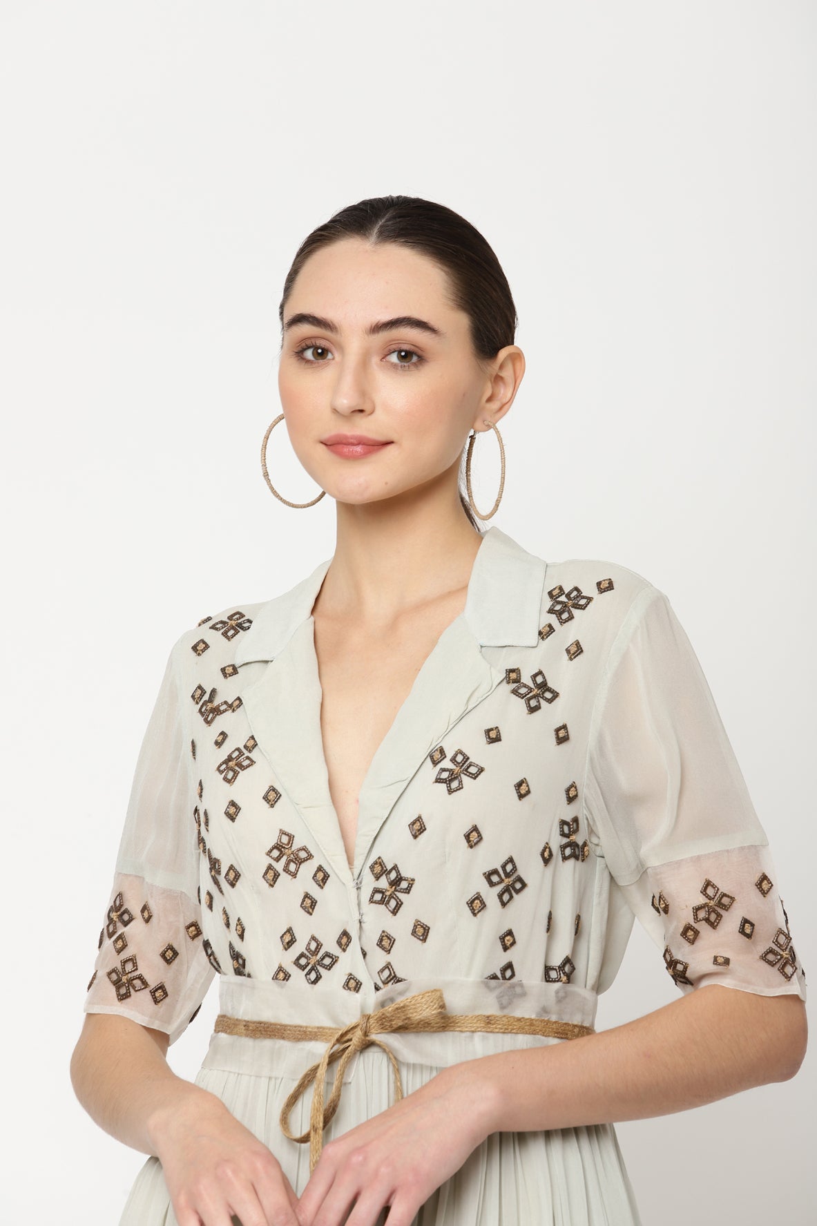 Barbera squirrel grey coloured dress in georgette and silk organza with metal and jute hand embroidered flowers detailing. Silk organza and jute tape belt to complete the look.