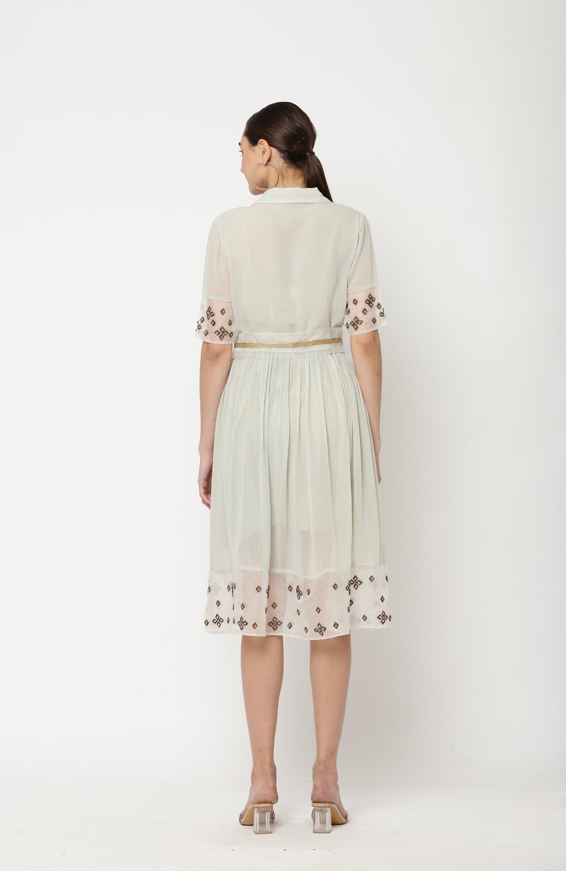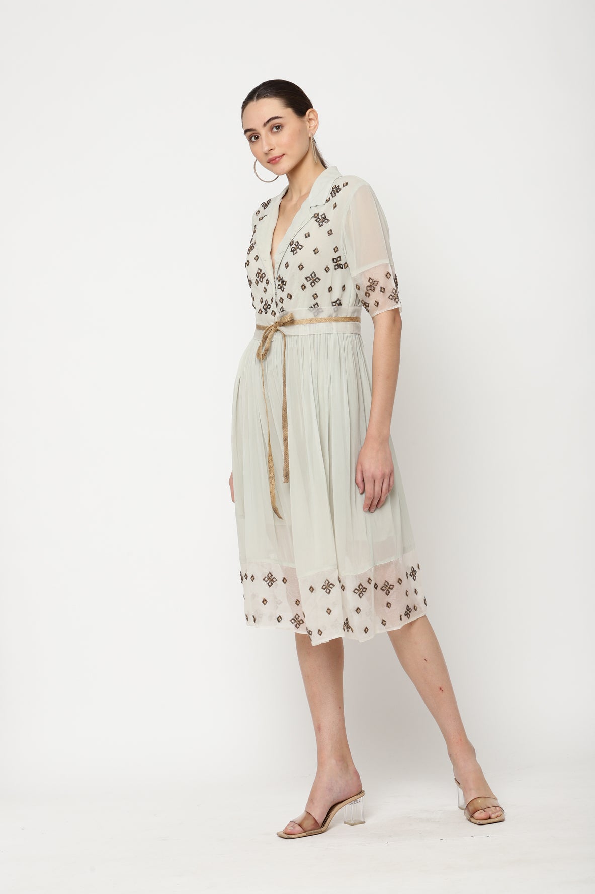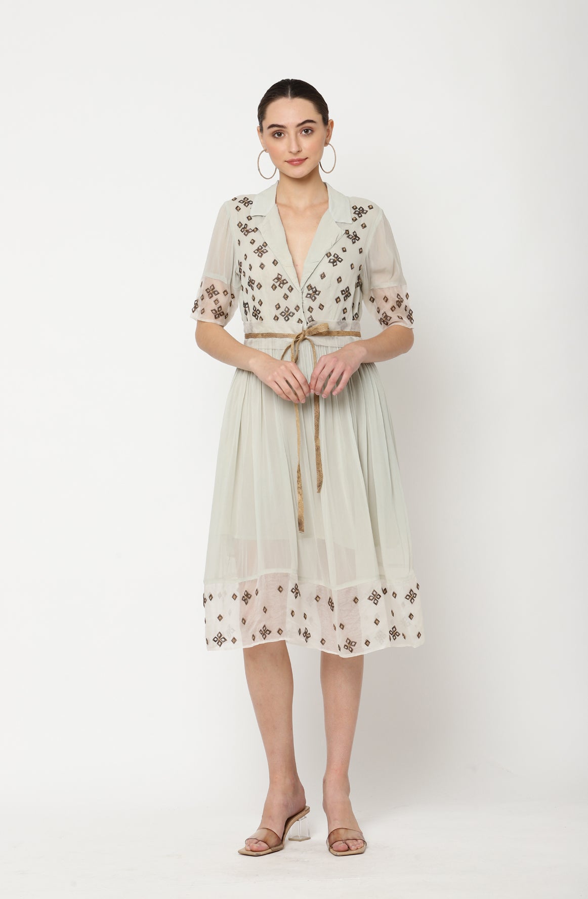 Barbera squirrel grey coloured dress in georgette and silk organza with metal and jute hand embroidered flowers detailing. Silk organza and jute tape belt to complete the look.