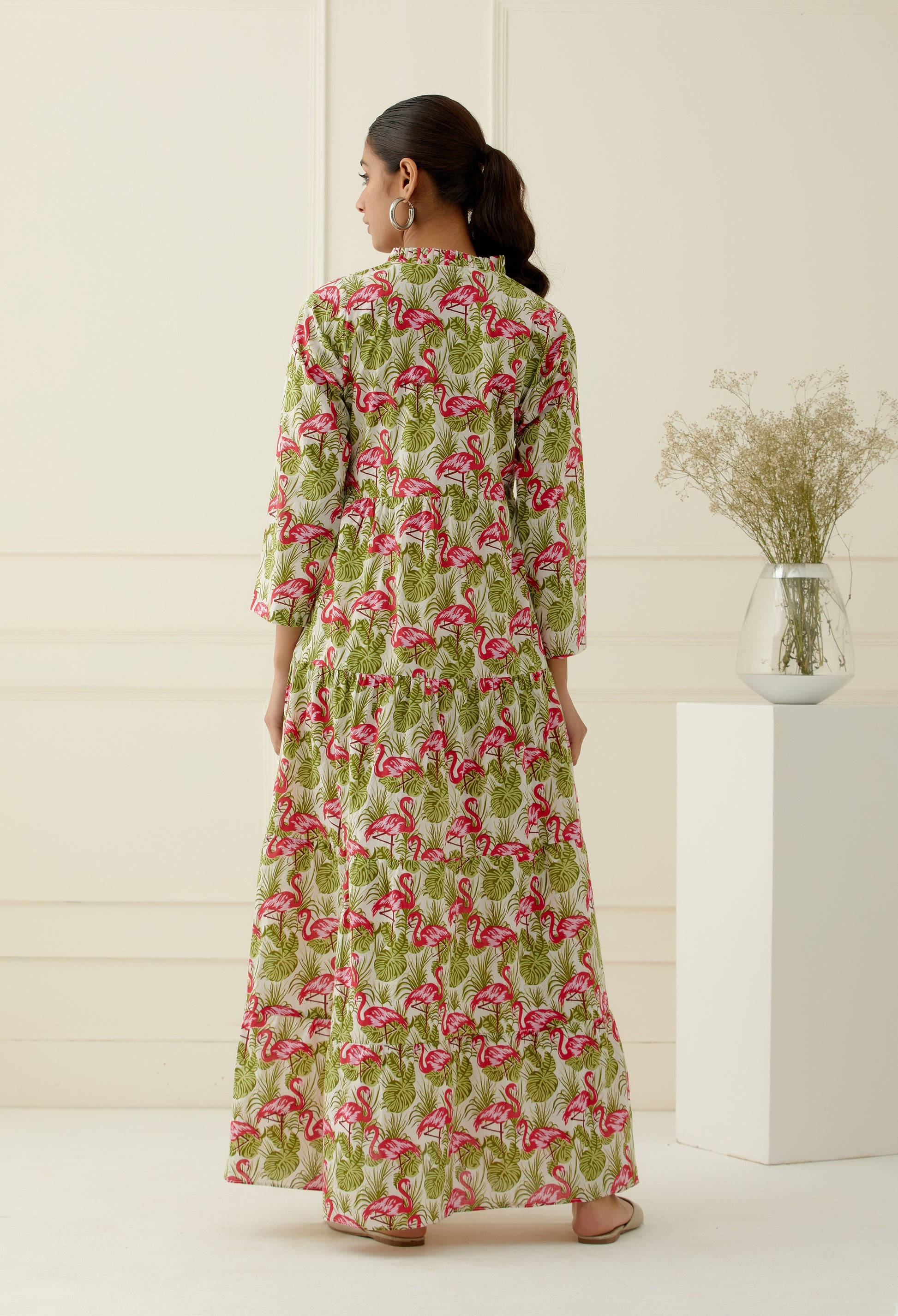 Brady Maxi dress in beautiful swamp print in tiers and loose sleeves. Gather detailing on the collar with tassel strings.