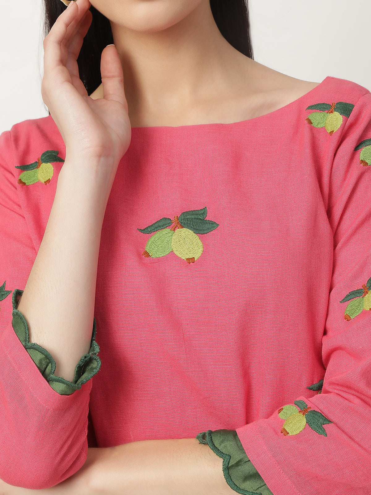 Pink colour boat neck short embroidered dress with deep green chanderi slip with scallop hemline detailing