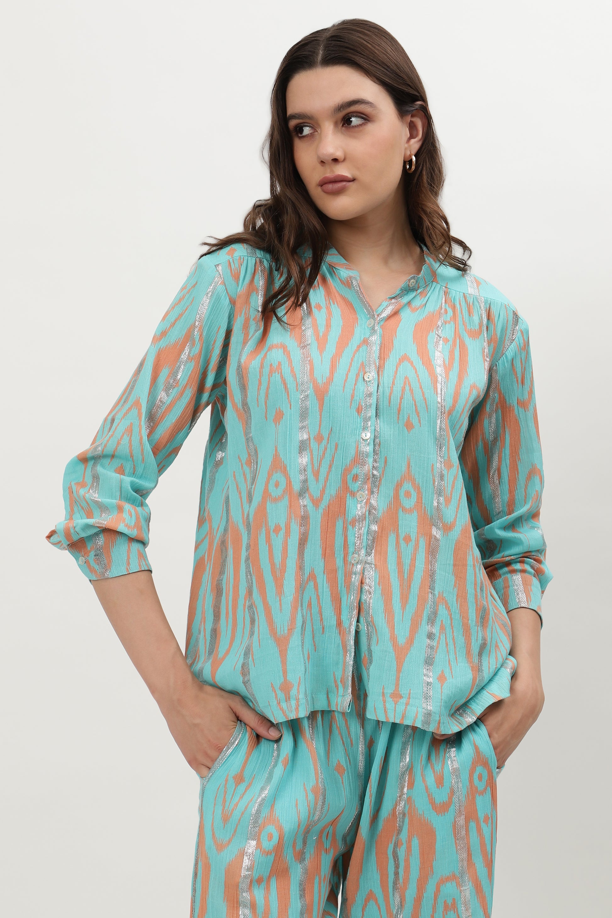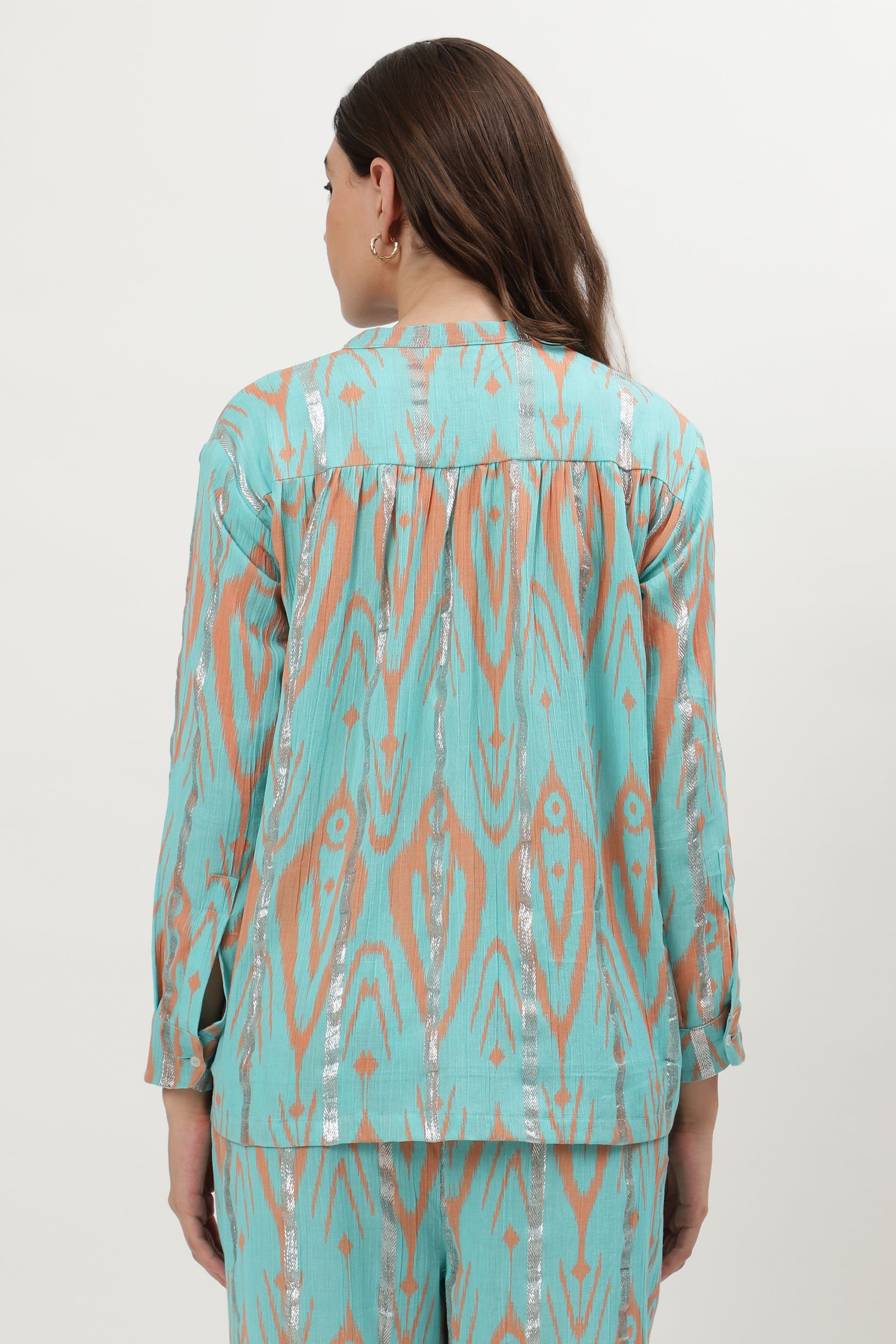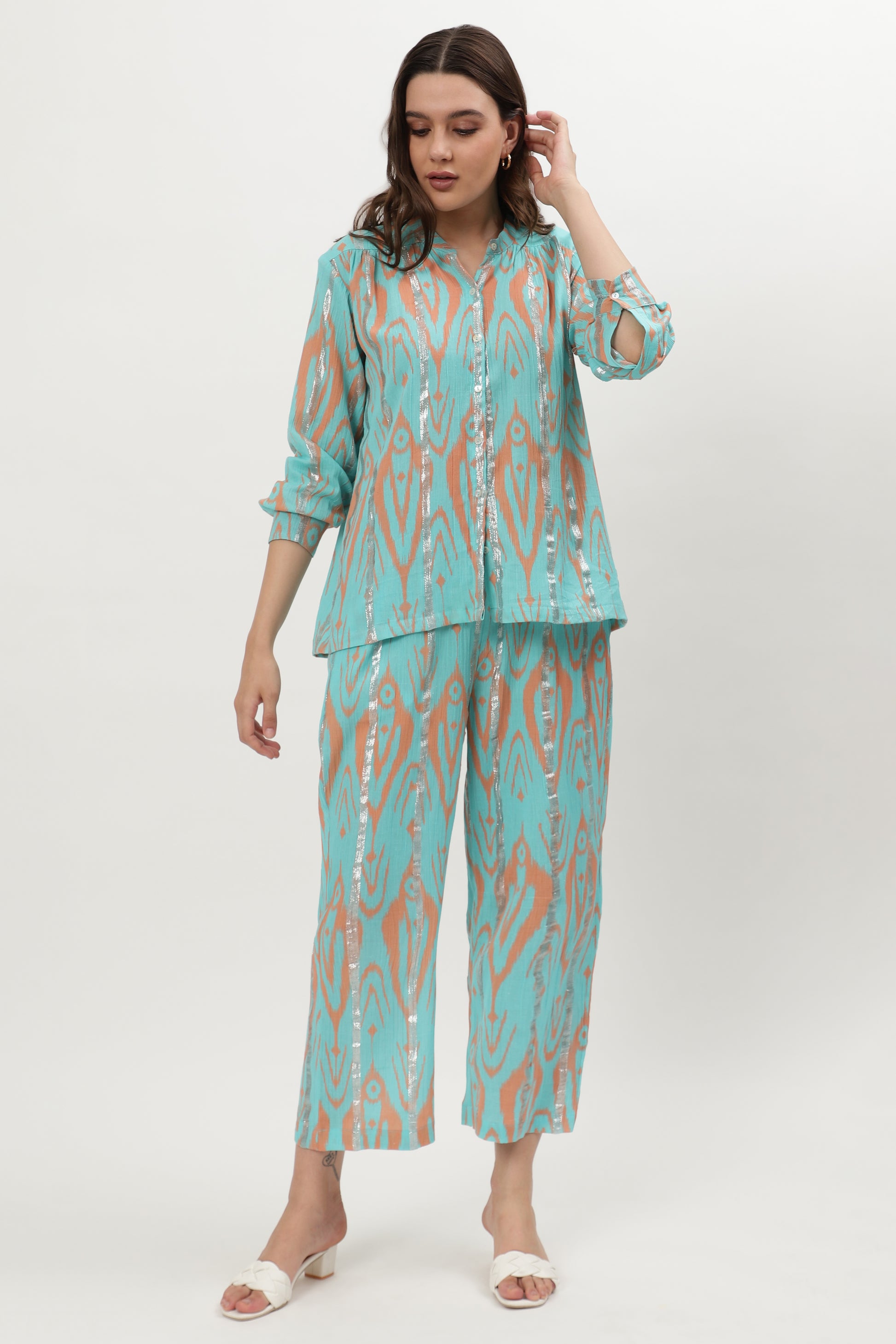 The Carrie cotton Co-ord Set by MUSAL offers a coordinated look with a modern ikat design. This set is ideal for casual outings, social events, or relaxed weekends, providing a stylish and cohesive ensemble.