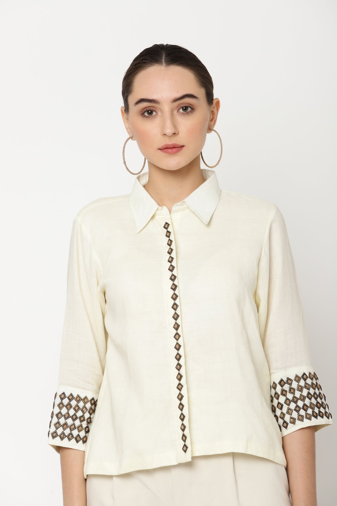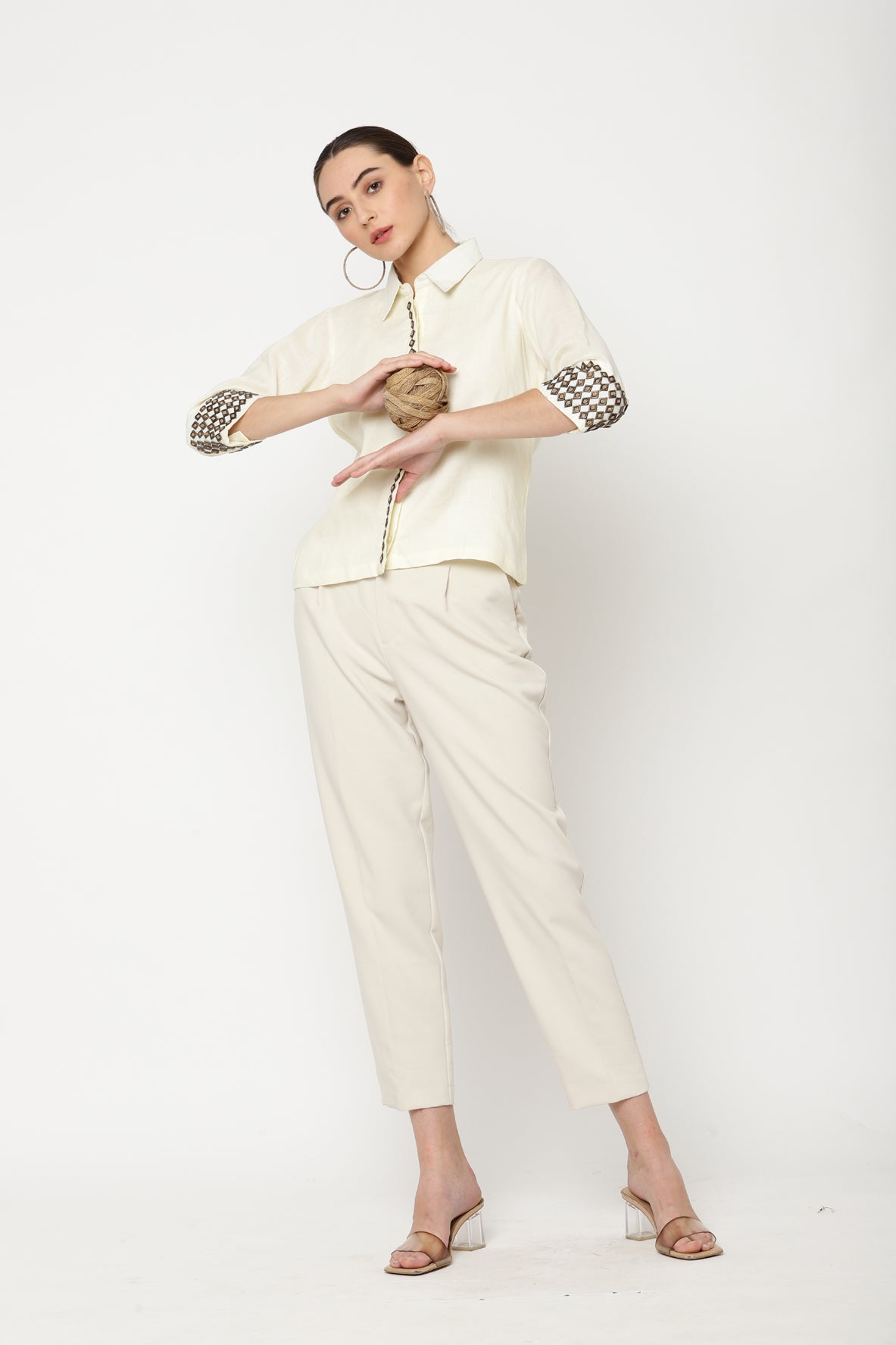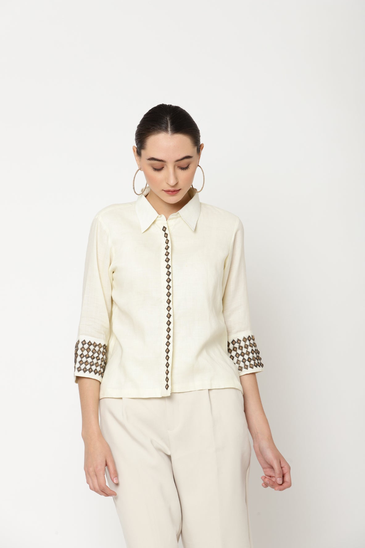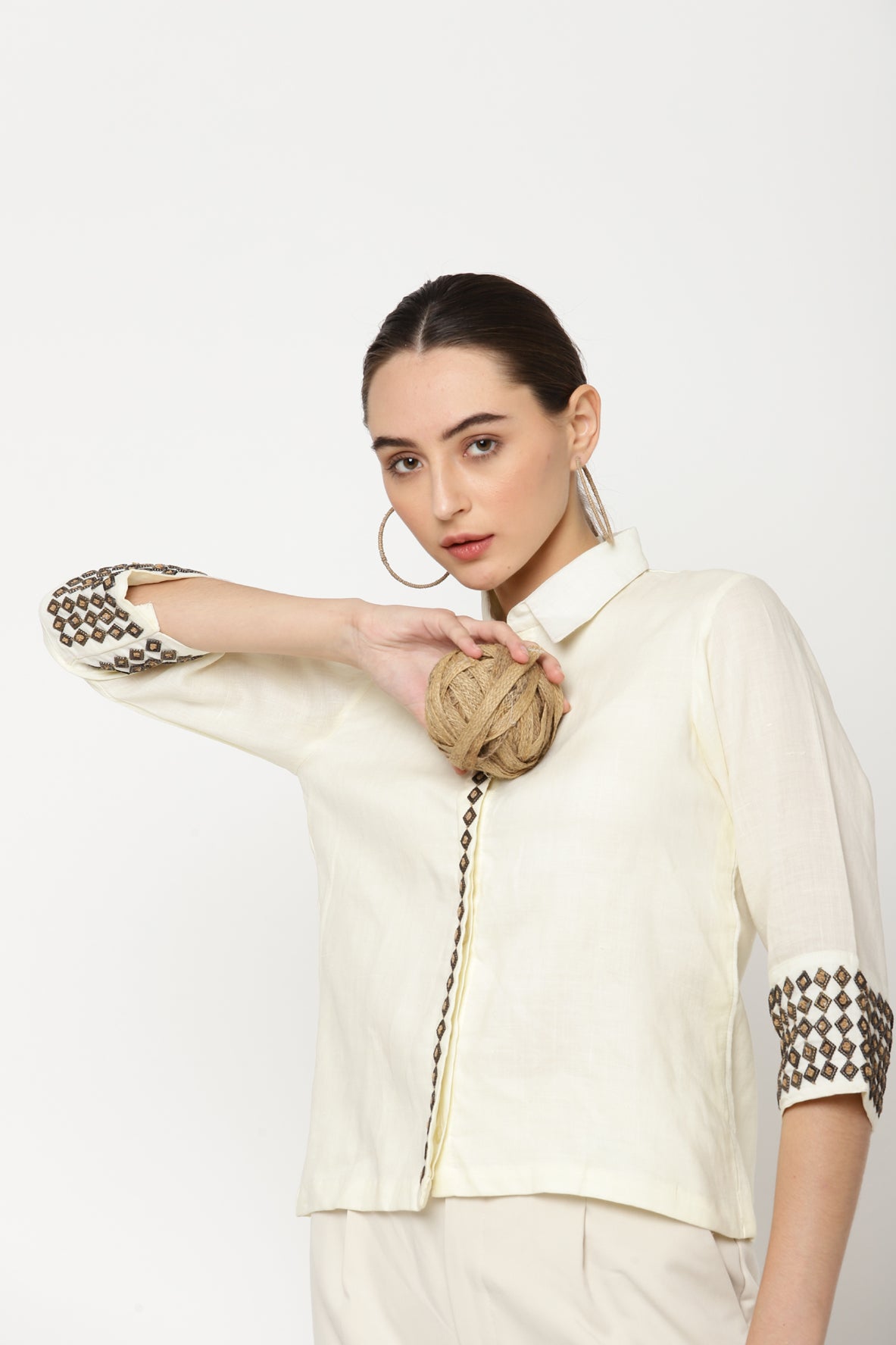 Chienin ivory coloured cropped shirt in cotton linen with metal and jute hand embroidery detailing on the placket and cuffs.