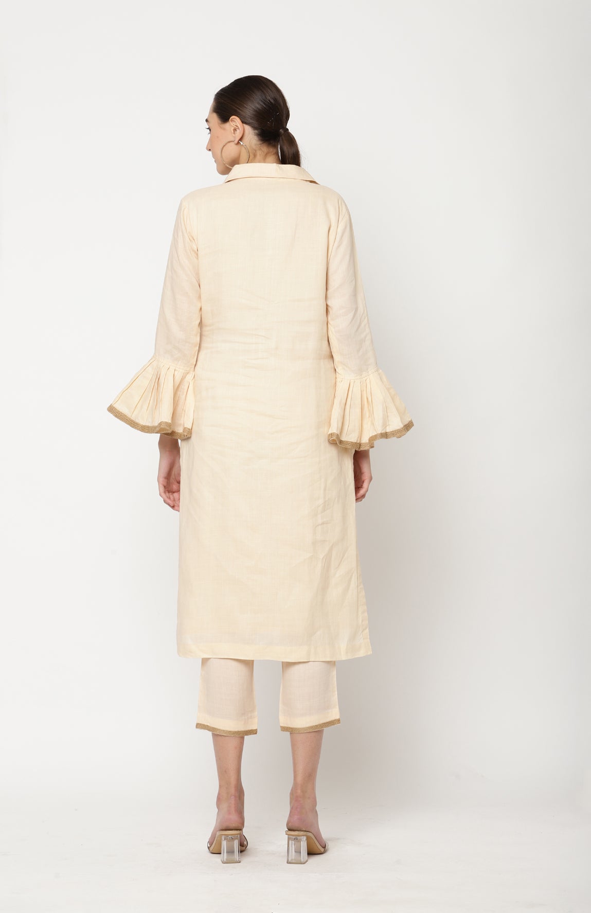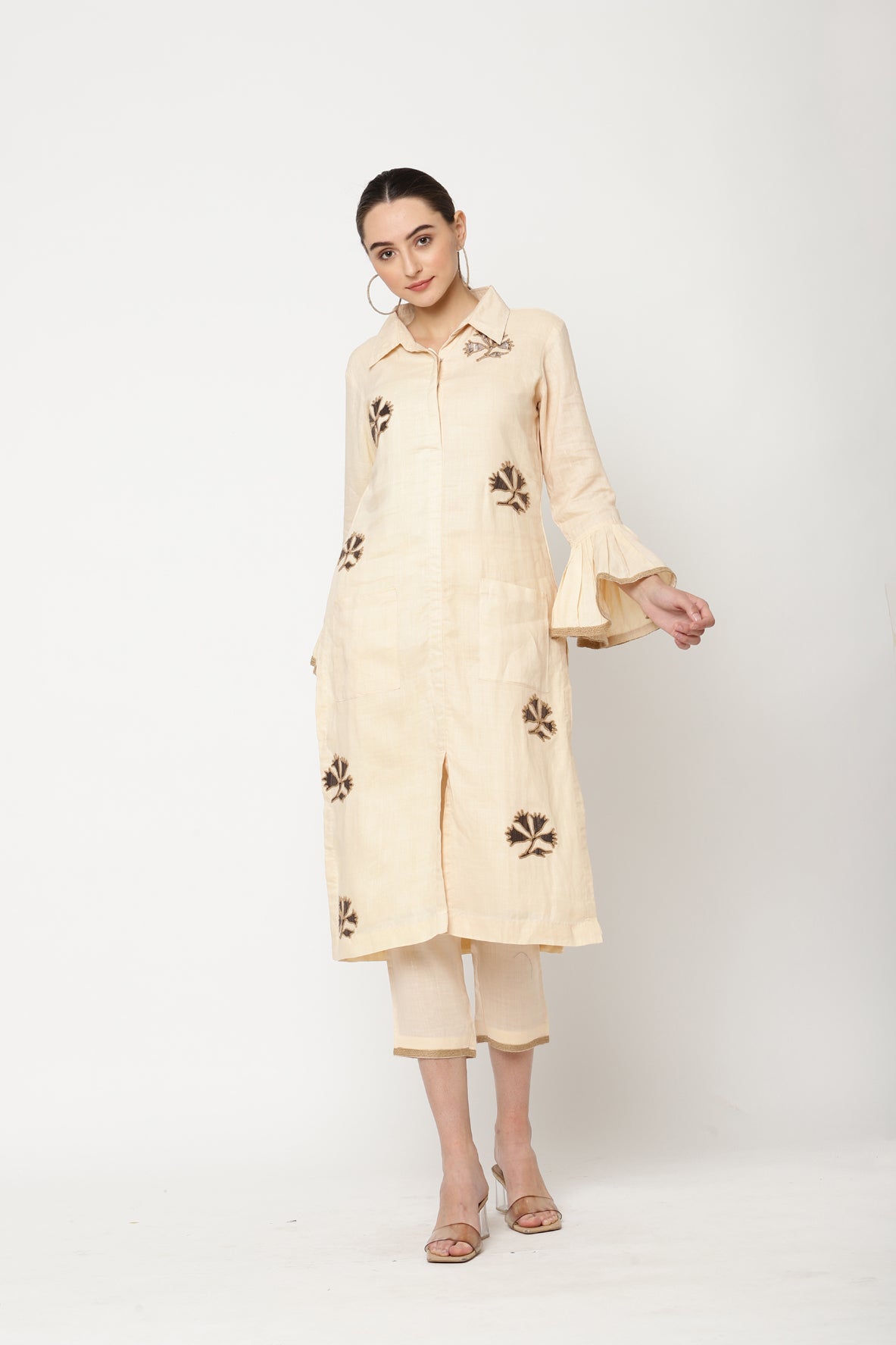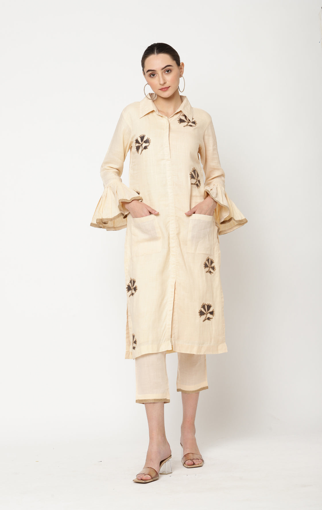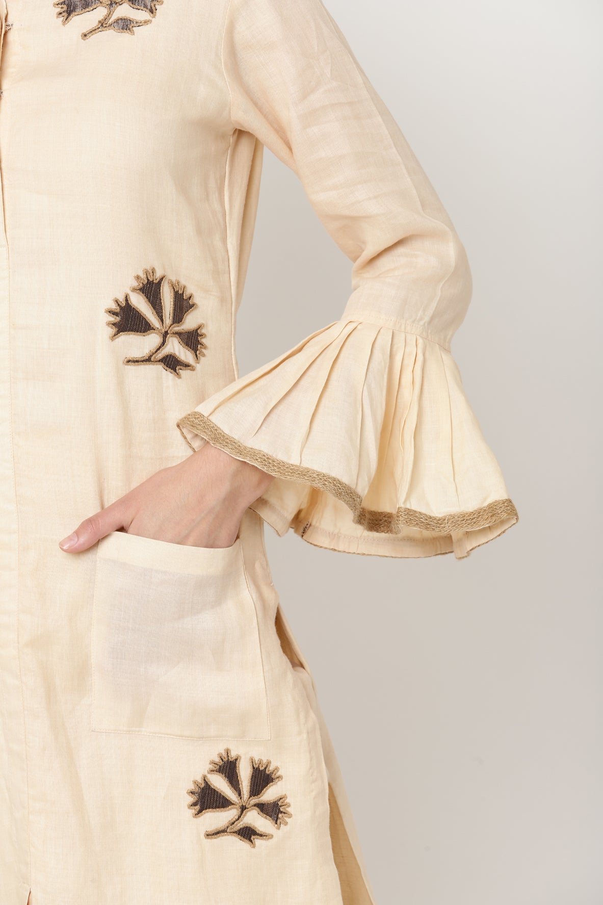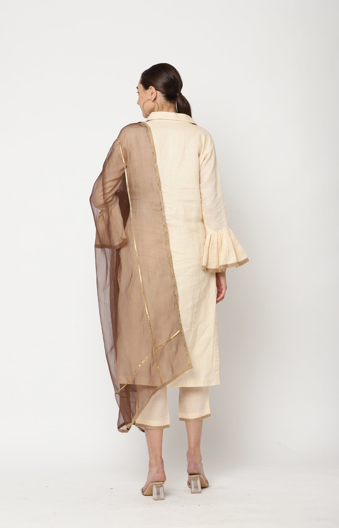 Cobernet almond milk colour three piece kurta set consists of cotton pants and kurta with applique hand embroidery,jute tape and pocket detailing.Silk organza dupatta in brown contrasting colour with jute and gota tape detailing.