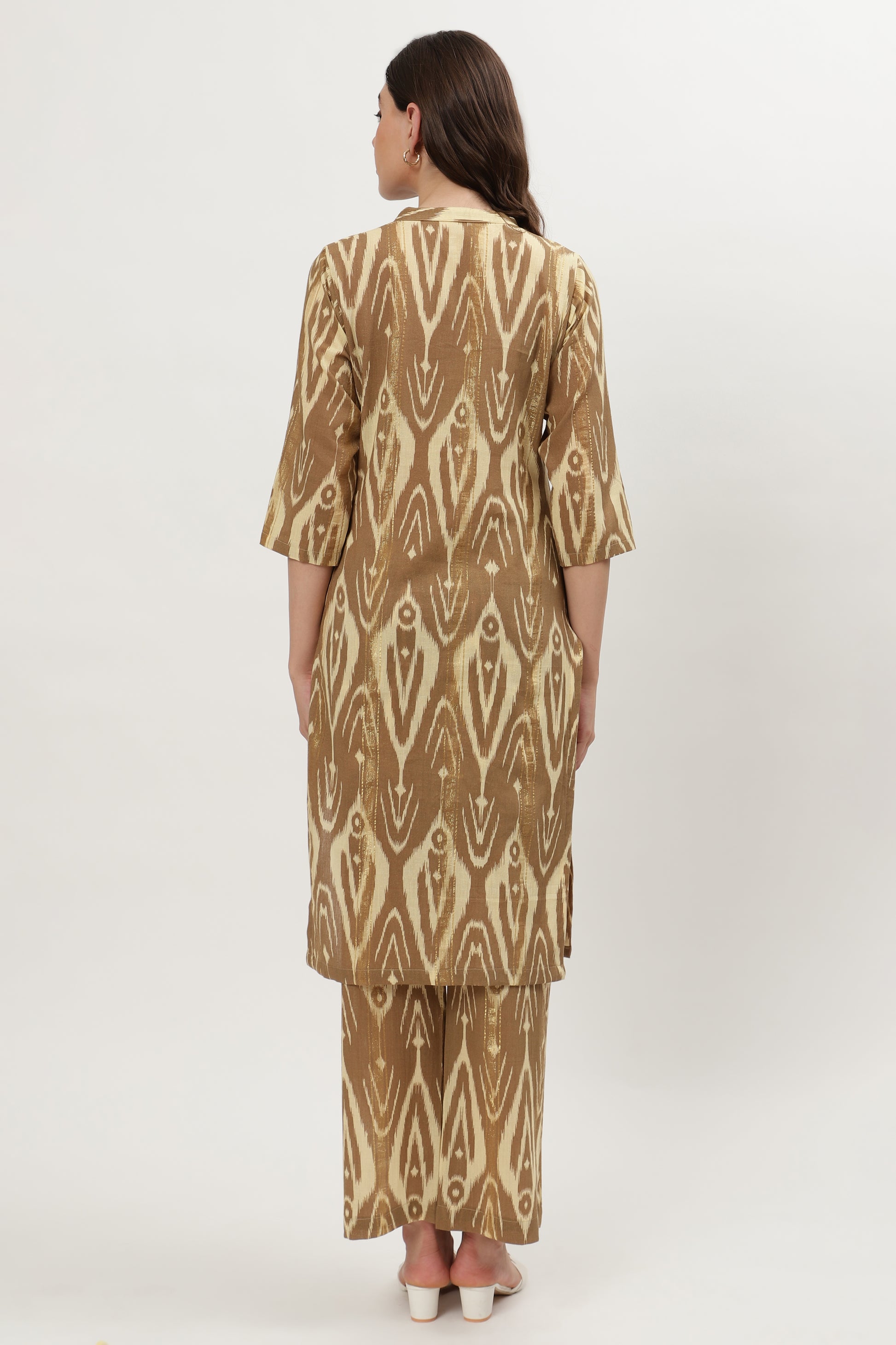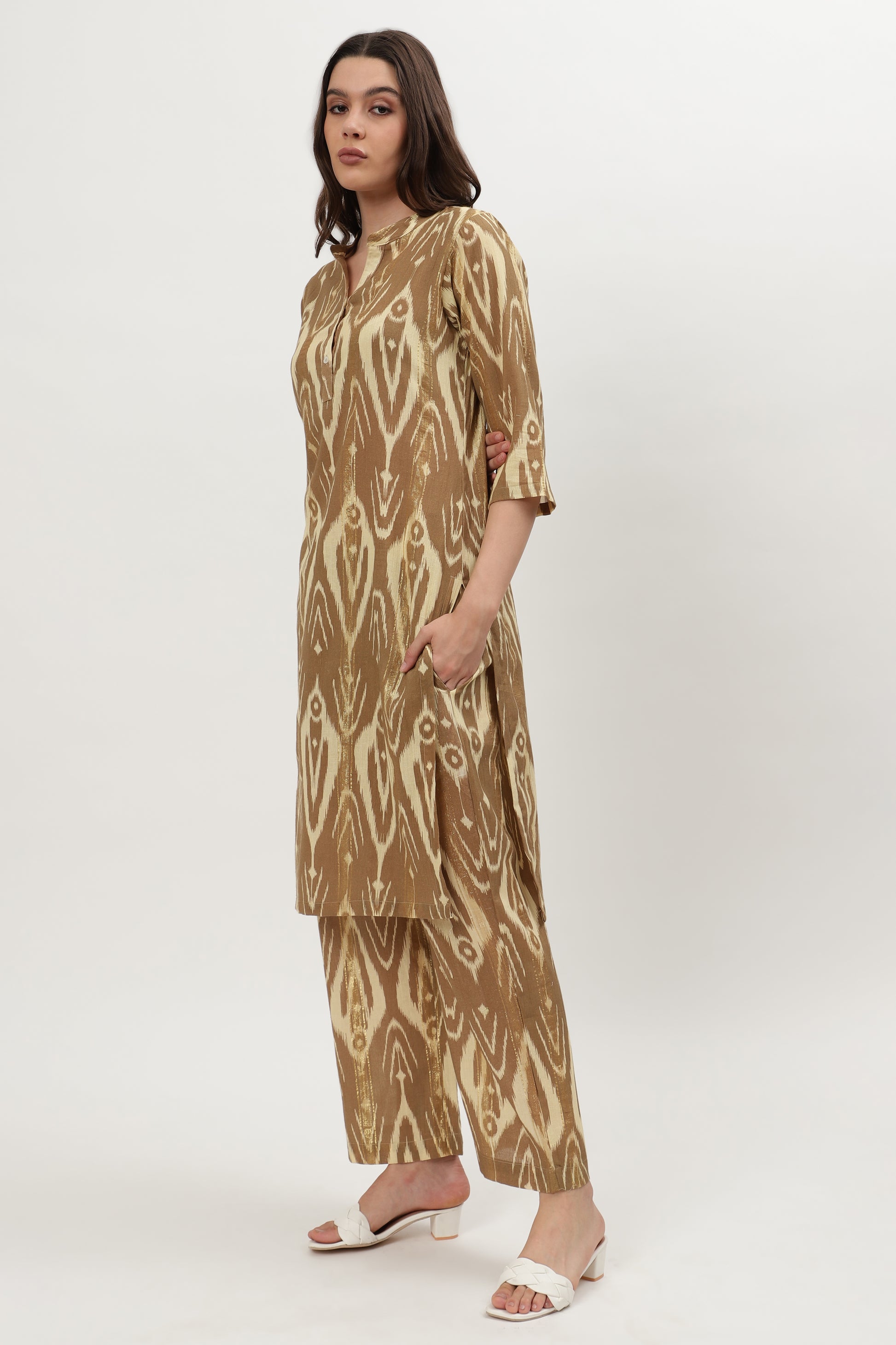 The Fiona cotton kurta set by MUSAL beautifully blends ethnic charm with modern aesthetics. Designed with a striking ikat pattern, this two piece ensemble is perfect for festive celebrations, casual gatherings, or cultural events, offering effortless grace and style.