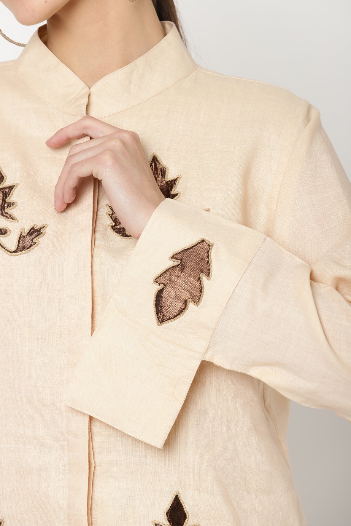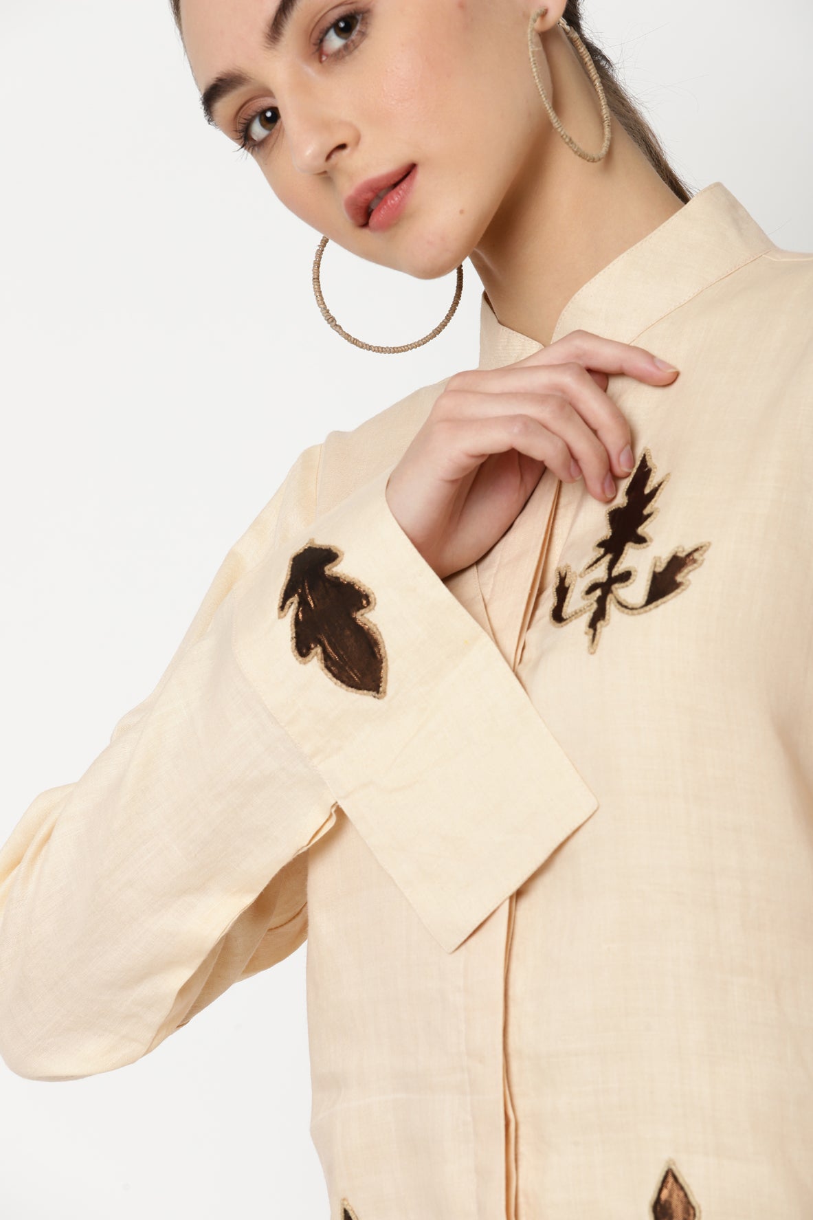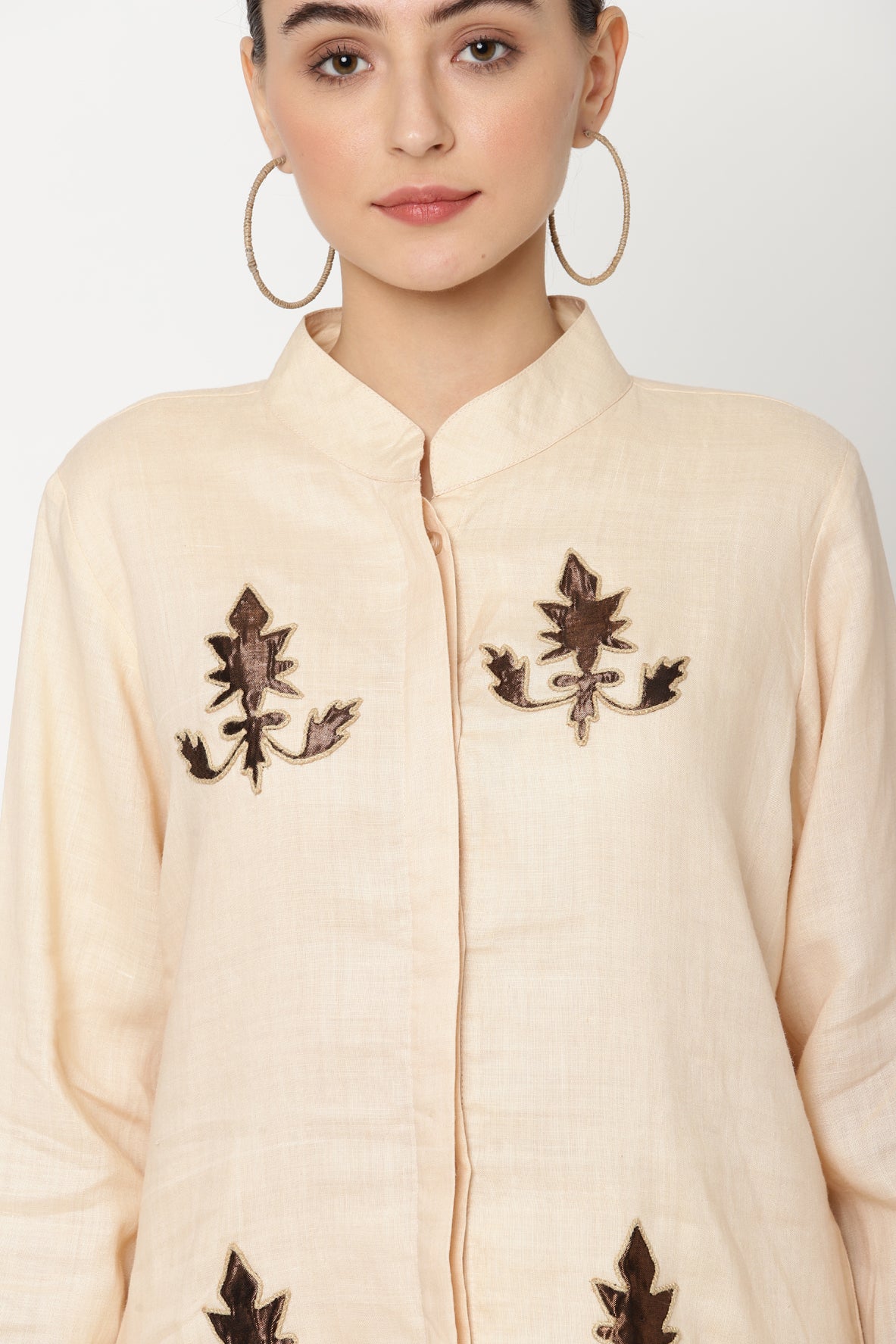 Grigio cotton linen band neck shirt in almond milk colour with applique hand embroidery detailing and extended cuffs.
