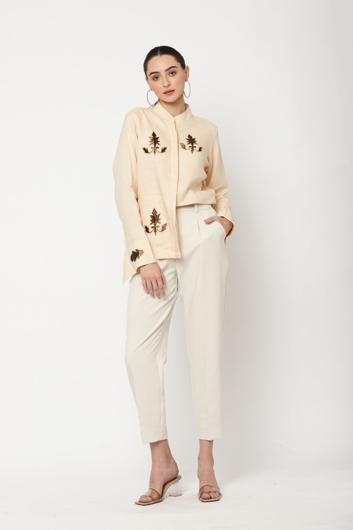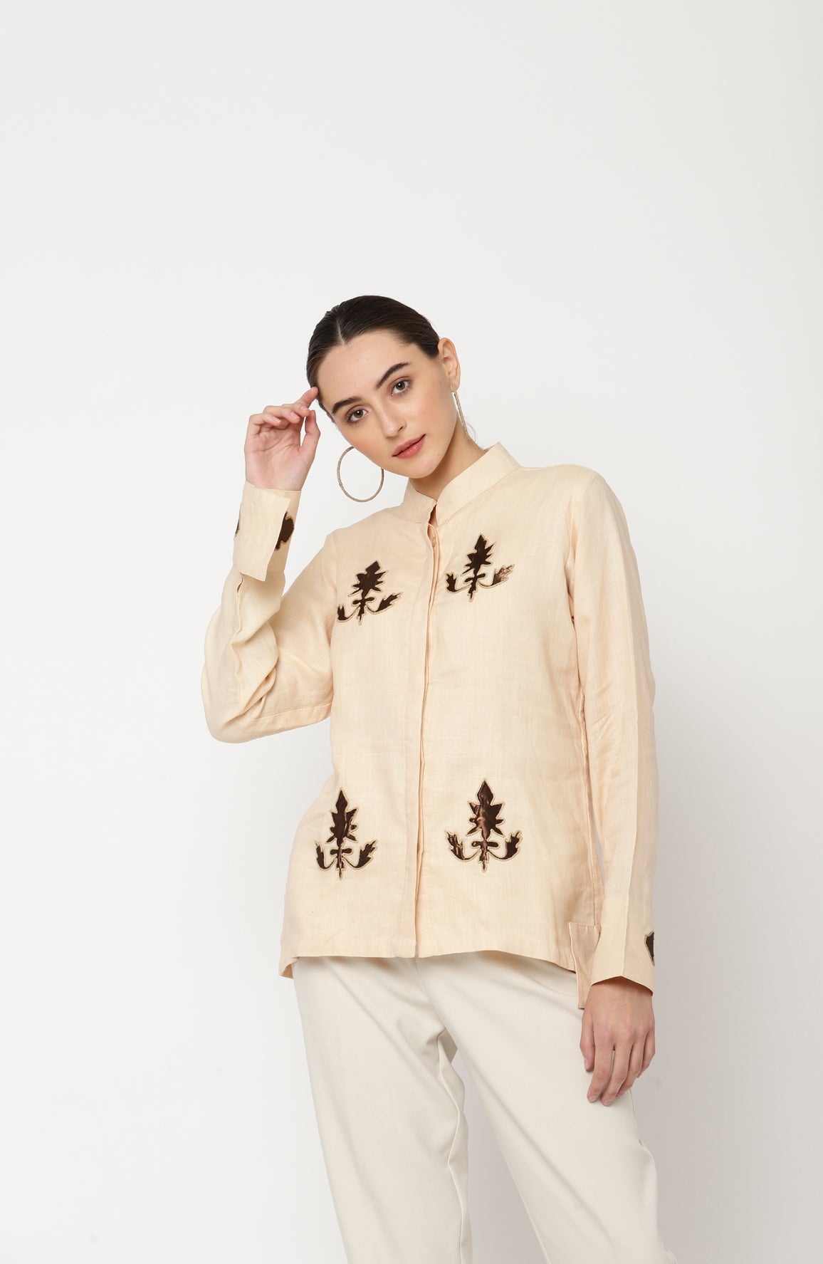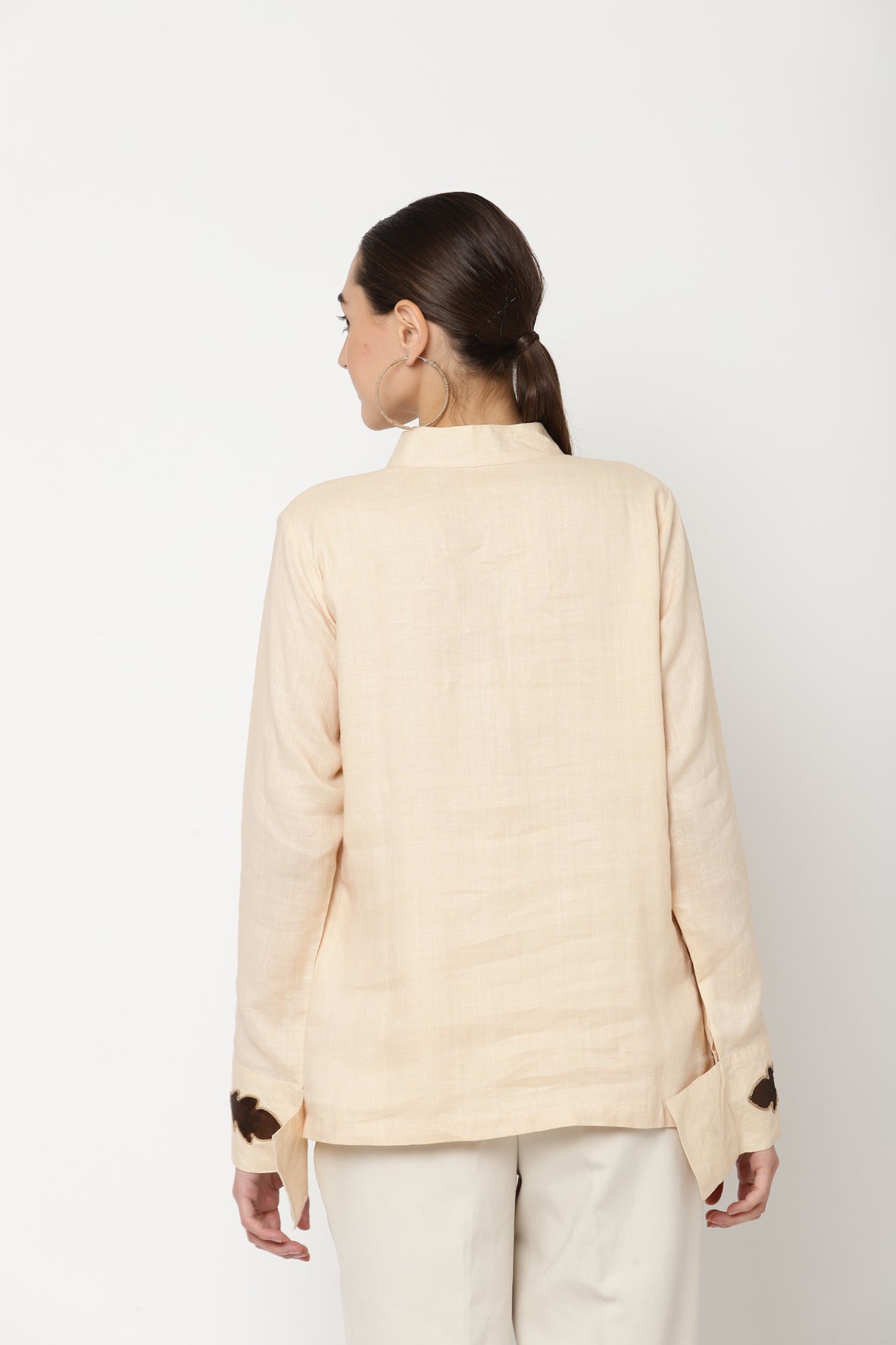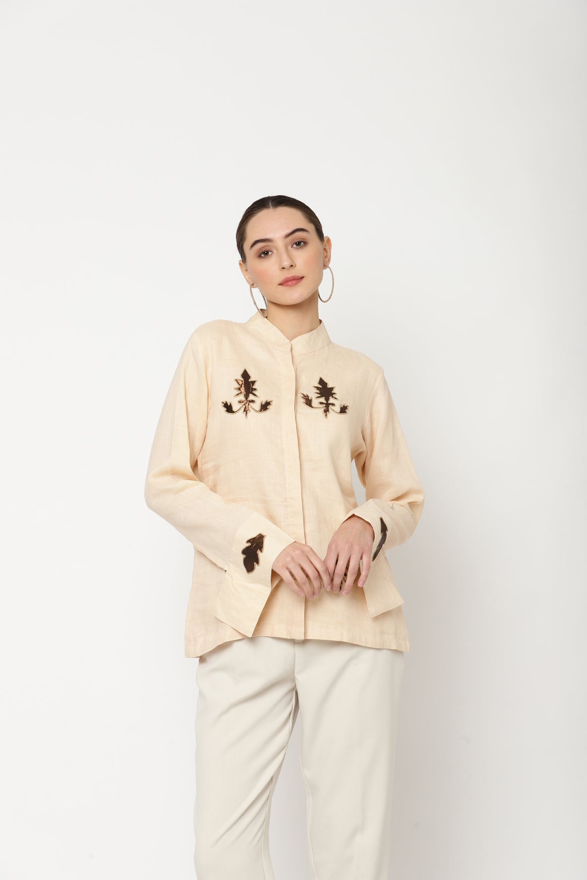 Grigio cotton linen band neck shirt in almond milk colour with applique hand embroidery detailing and extended cuffs.