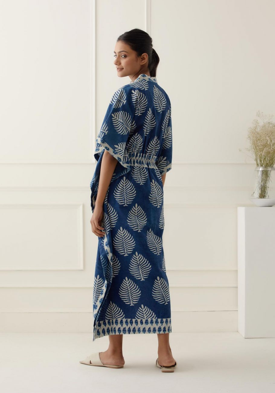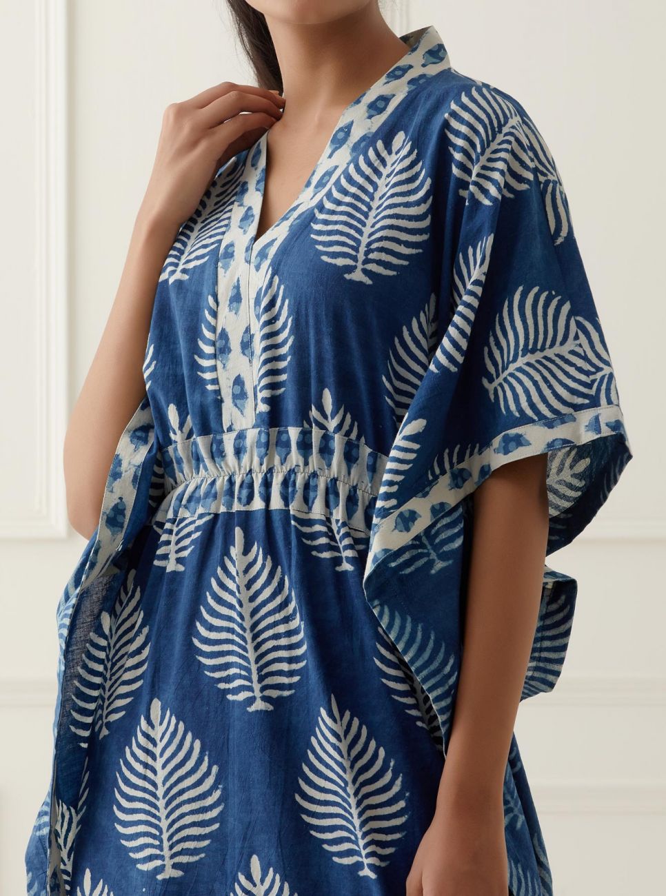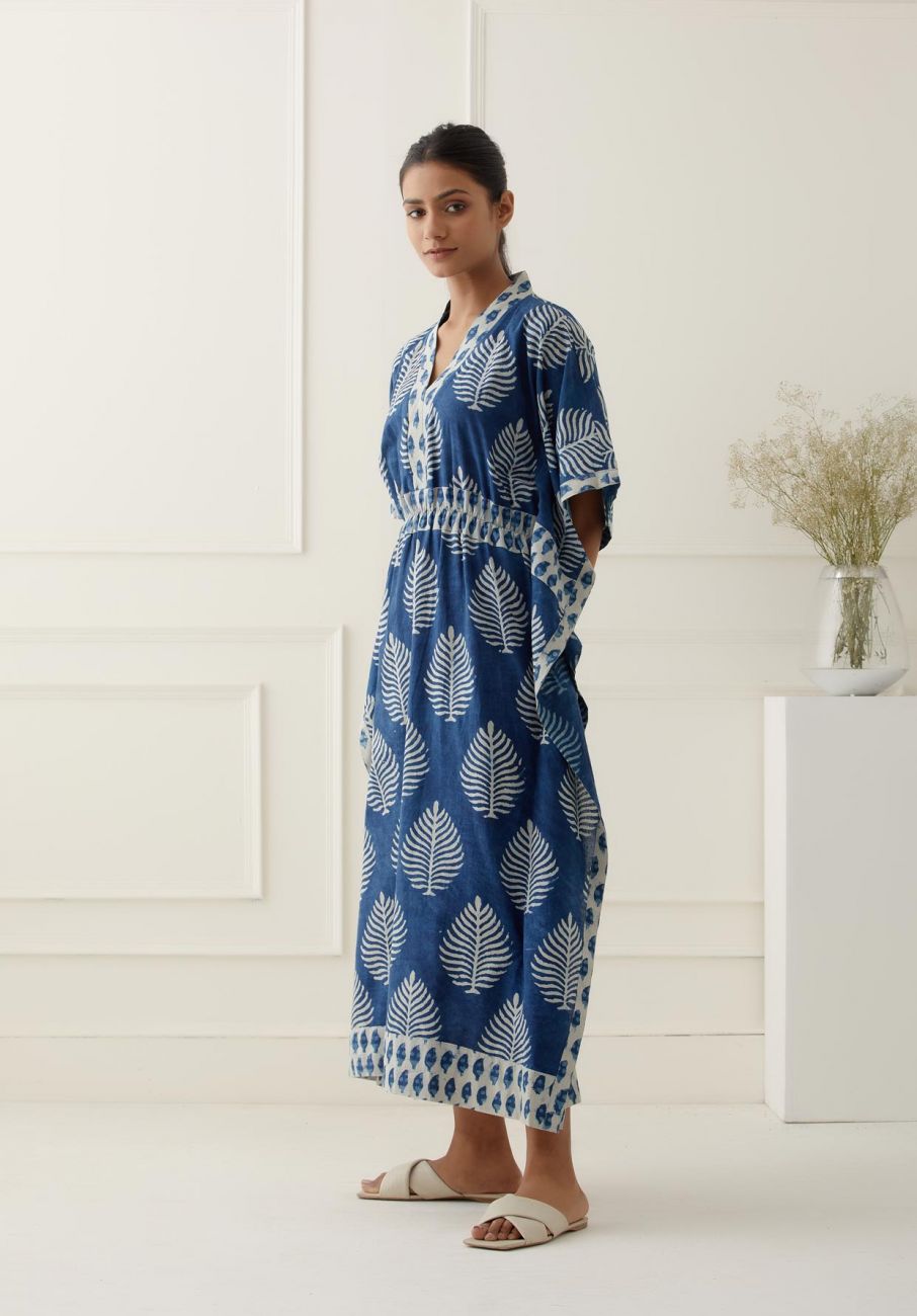 Musal indigo hand block print printed kaftan with elasticated waist and border detailing.