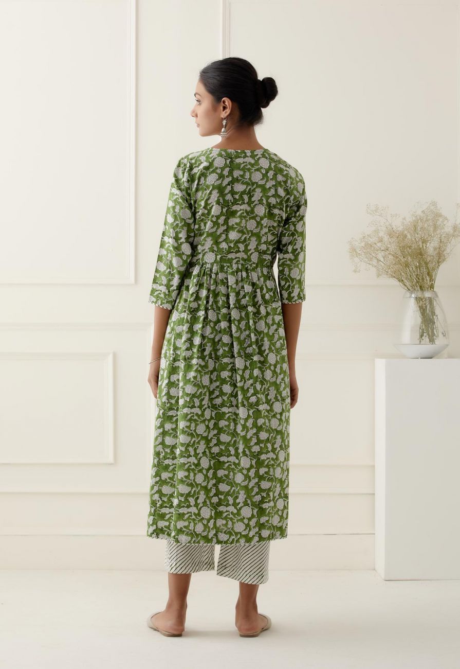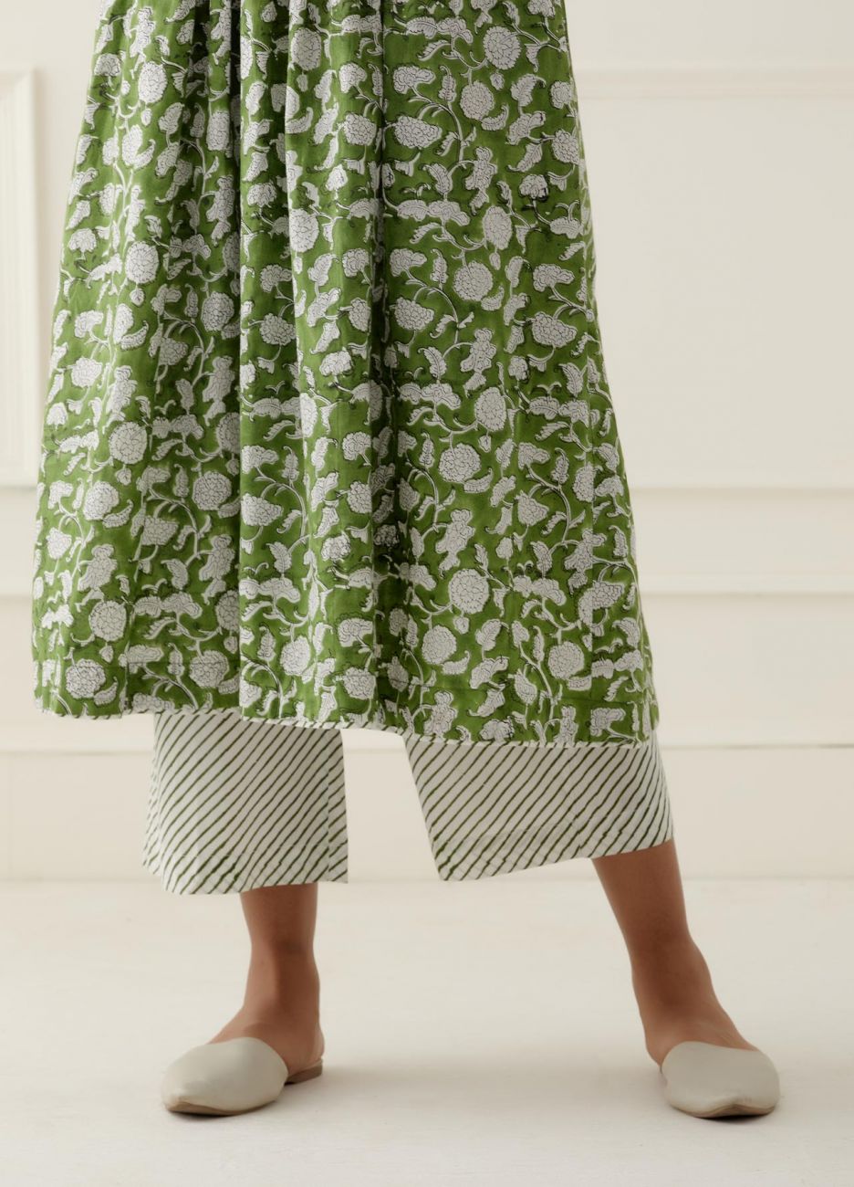 Musal block print three piece kurta set with lace detailing. Featuring hand-block prints, a matching dupatta, and comfortable bottoms.