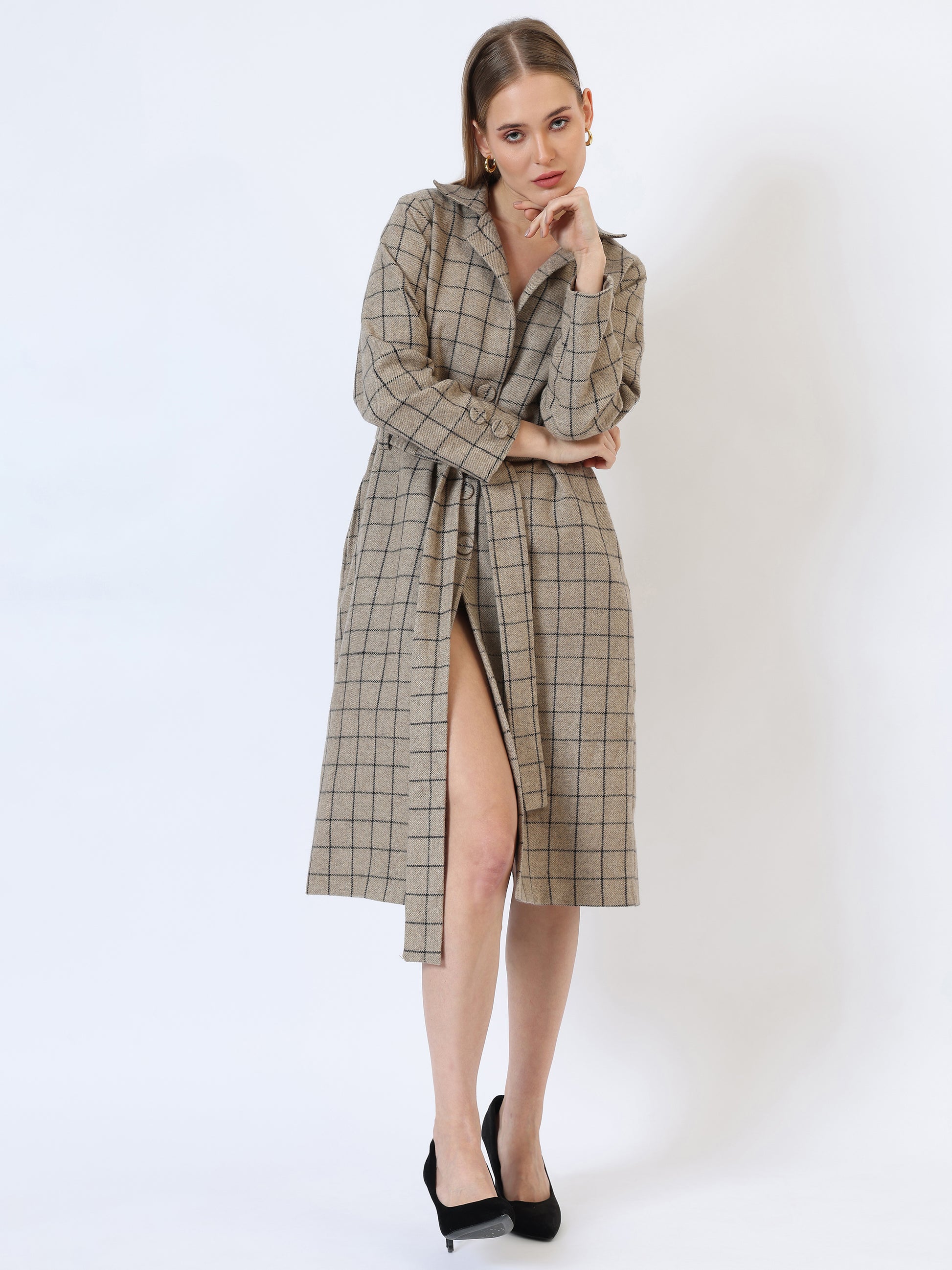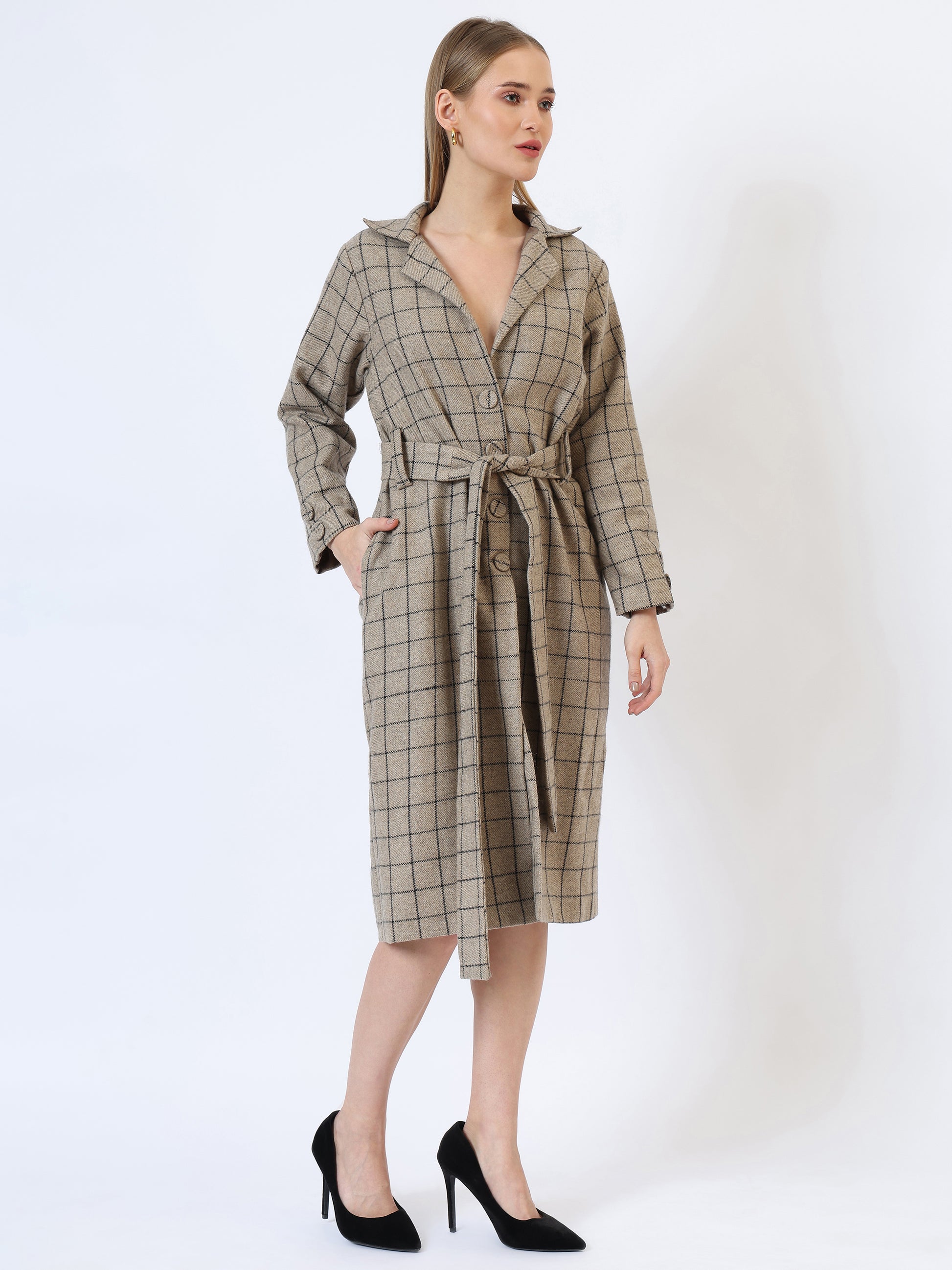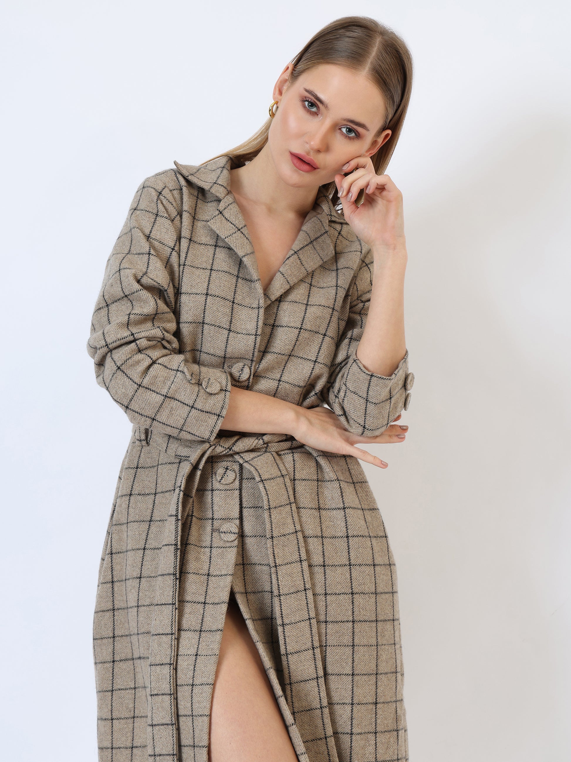 Long finely tailored trench coat in greenish beige and black check pattern made out of premium-grade knitted wool fabric finished with elegant belt and fabric covered buttons for seamless finish.