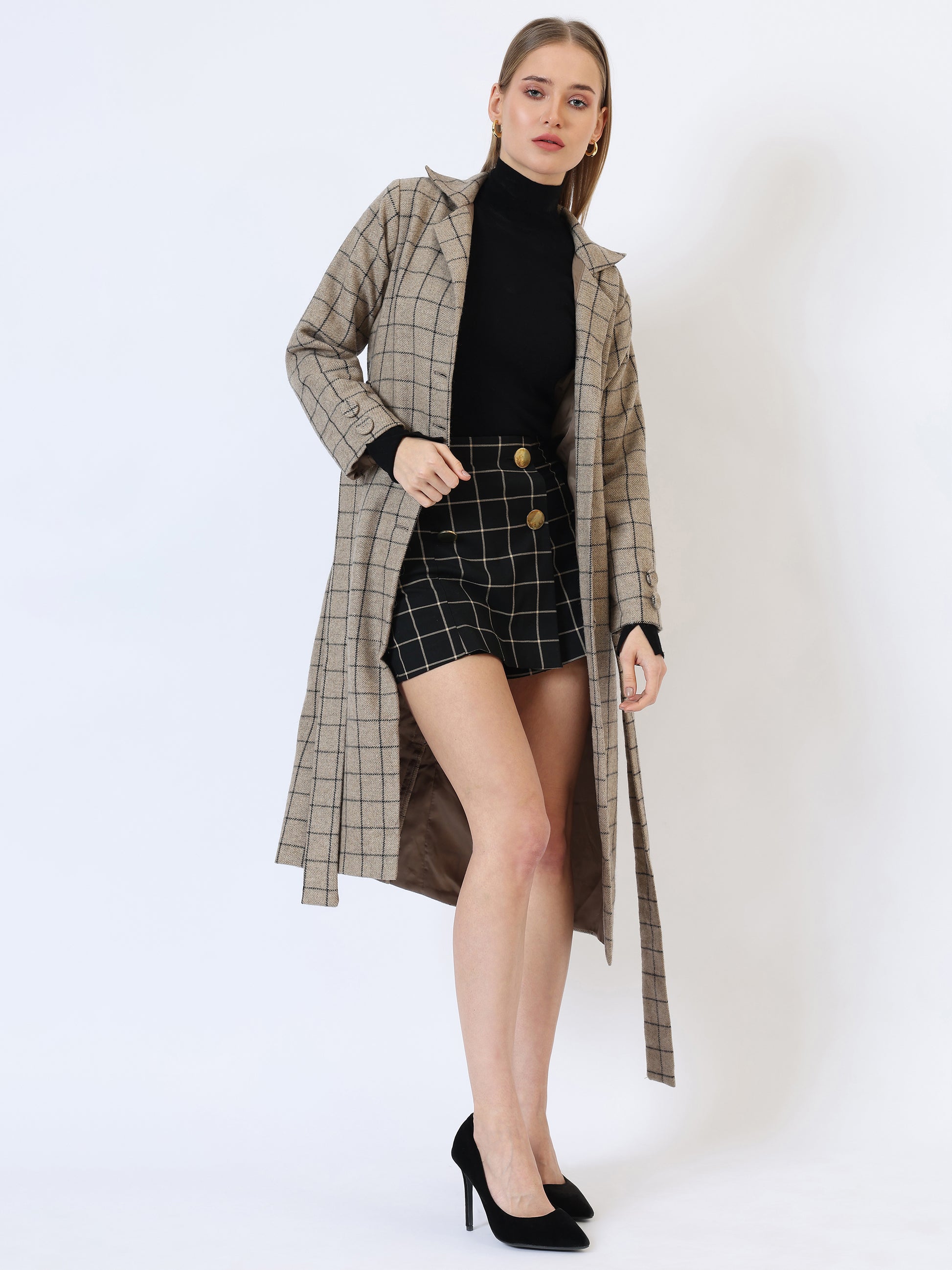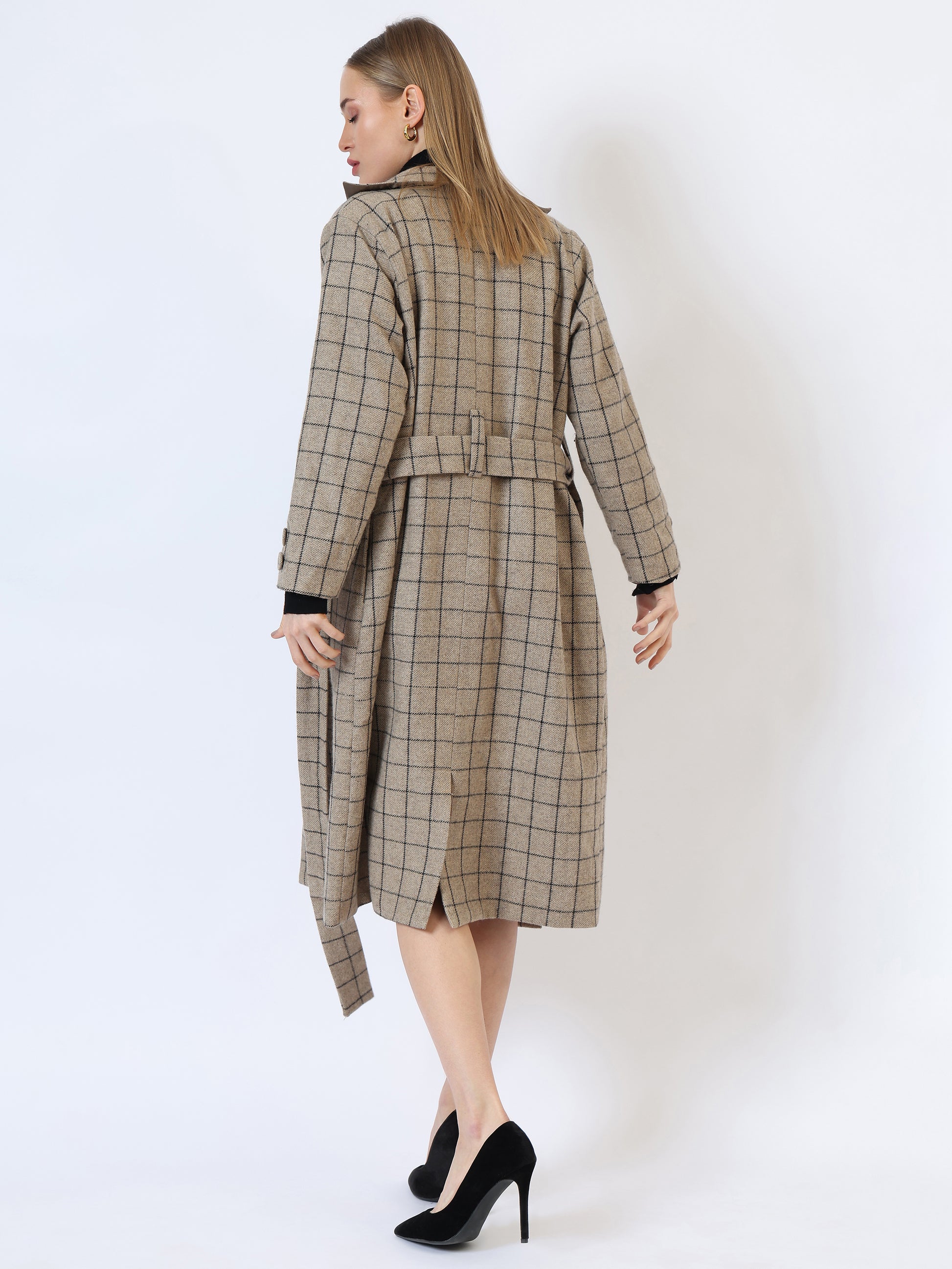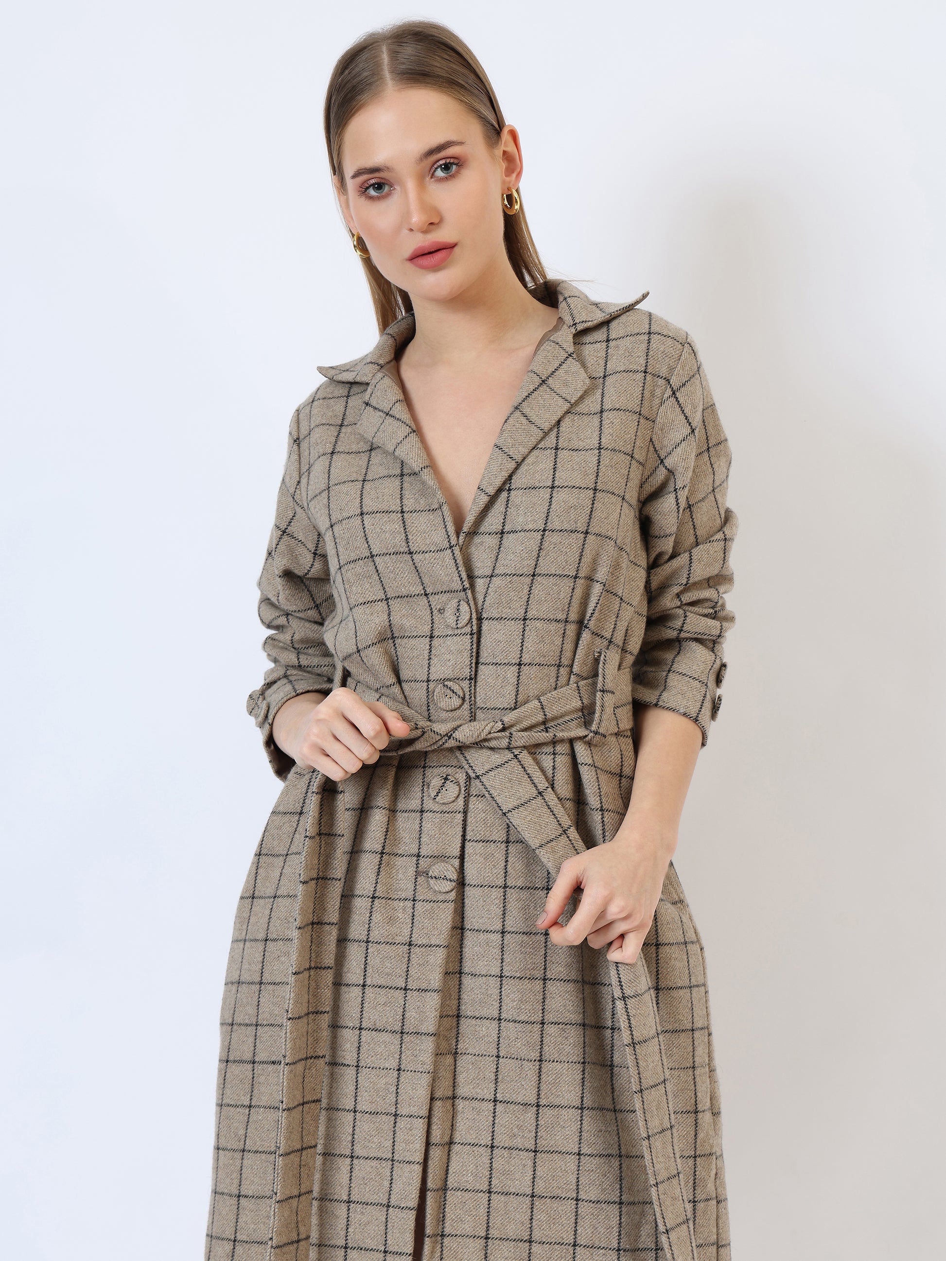 Long finely tailored trench coat in greenish beige and black check pattern made out of premium-grade knitted wool fabric finished with elegant belt and fabric covered buttons for seamless finish.