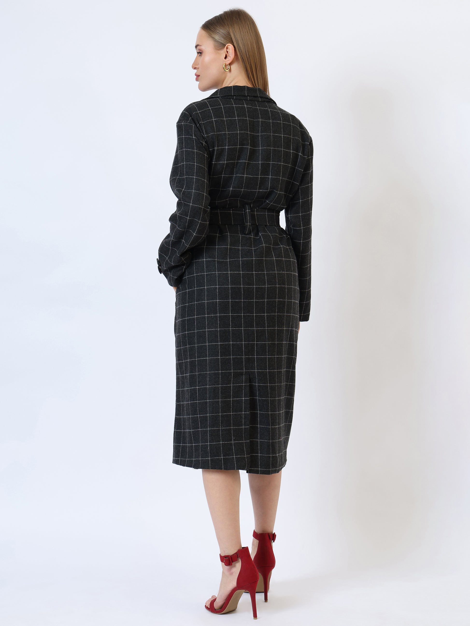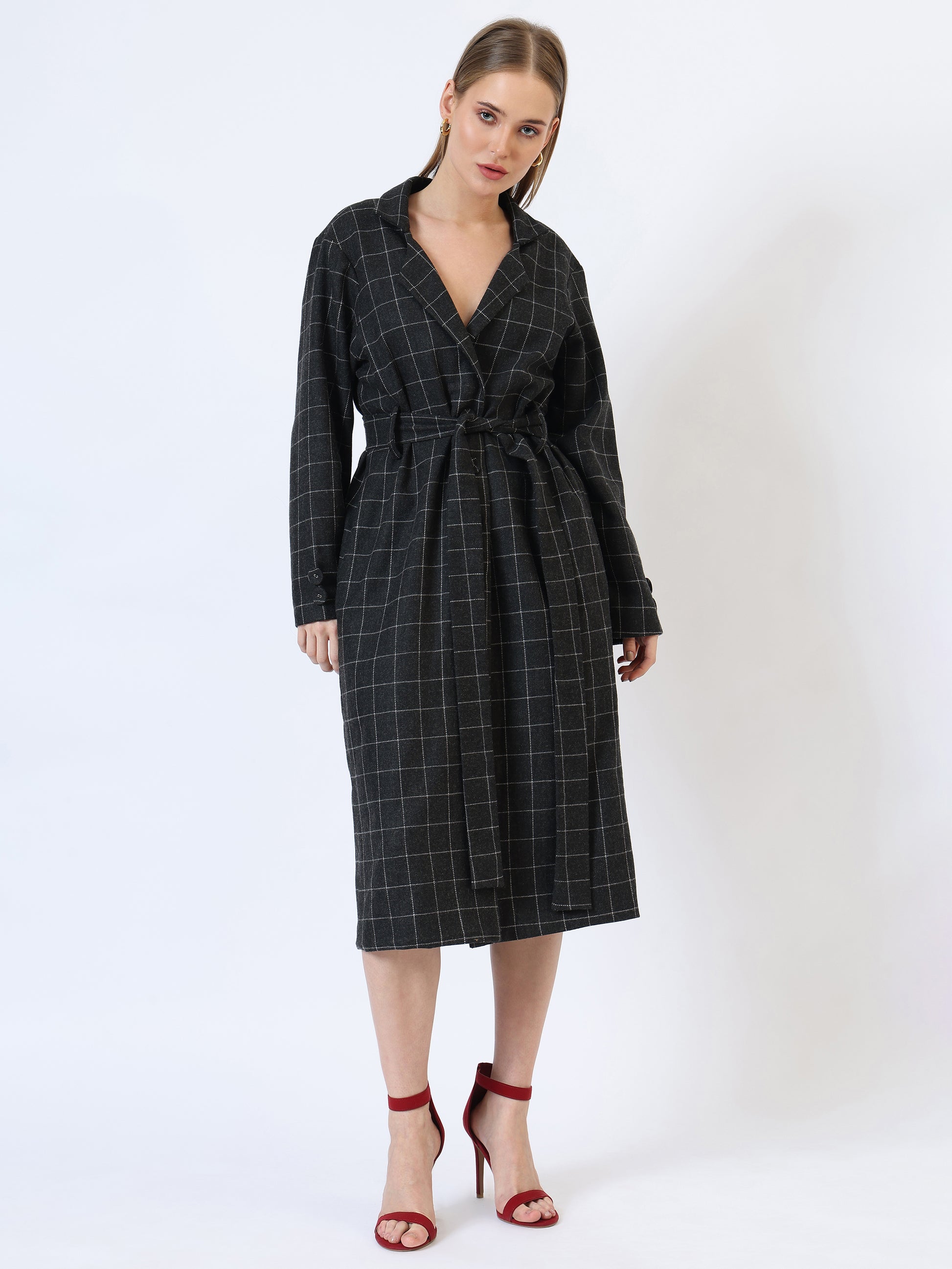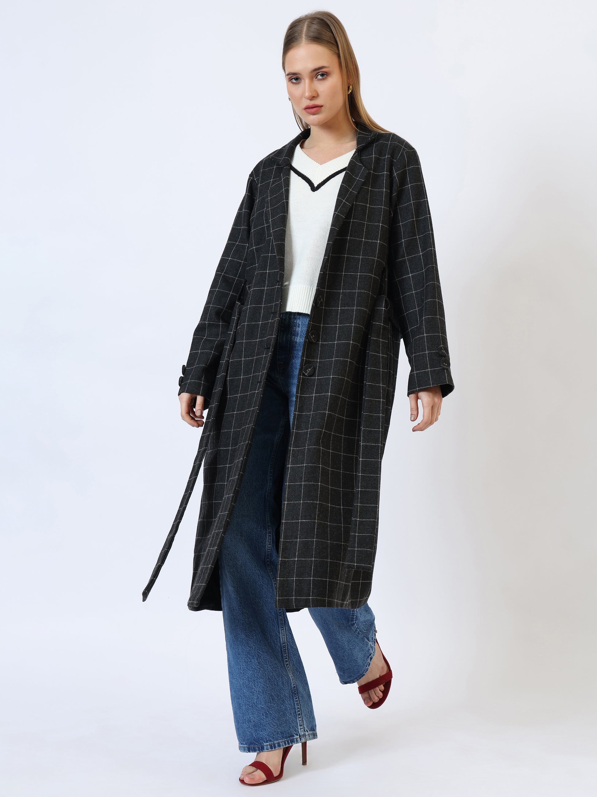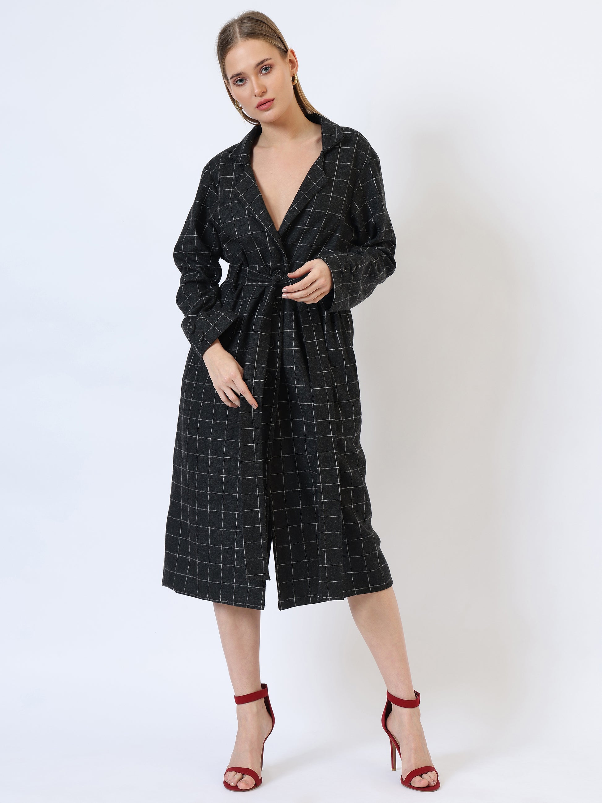Long finely tailored trench coat in black and white check pattern made out of premium-grade knitted wool fabric finished with elegant belt and fabric covered buttons for seamless finish.