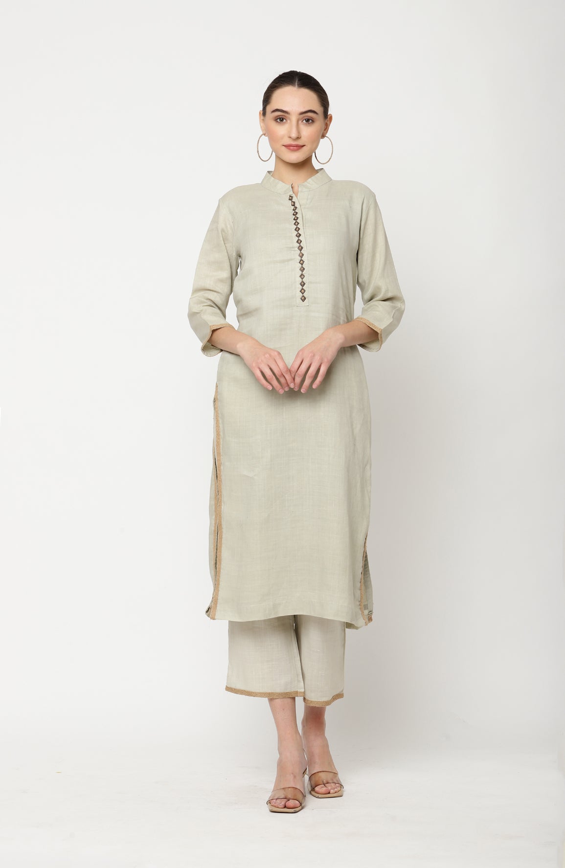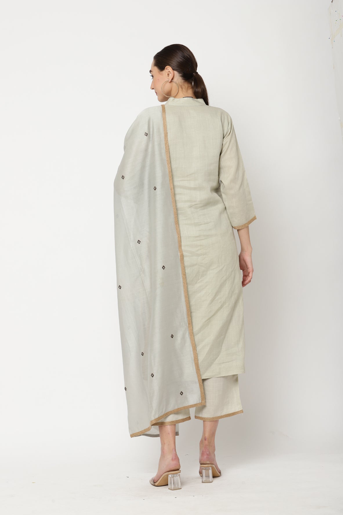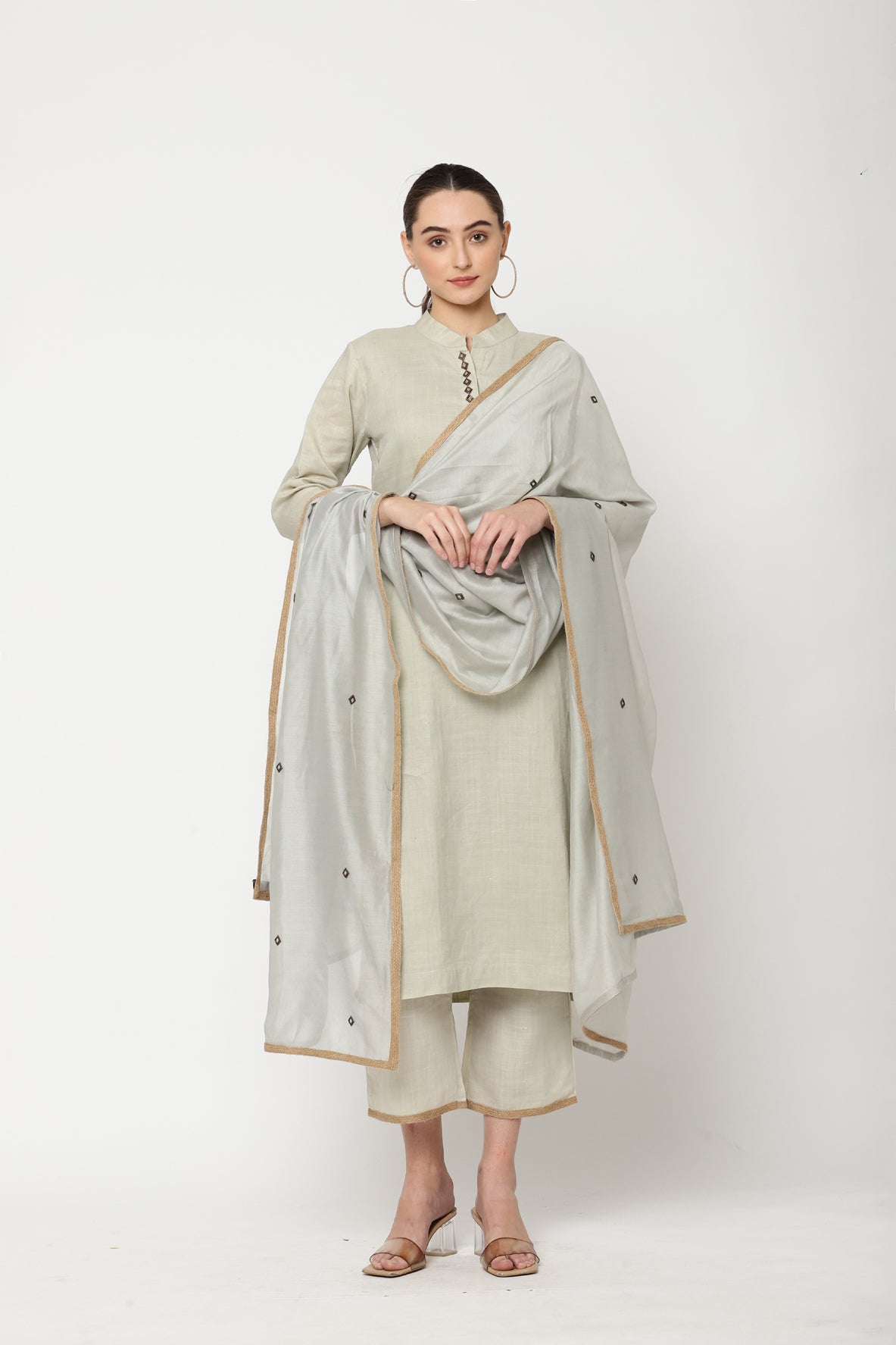 Semillion squirrel grey colour three piece kurta set consisting of cotton linen pants and kurta with jute and metal hand embroidery detailing on the neck. Same colour dupatta in cotton silk with metal embroidery and jute tape border detailing to complete the look.