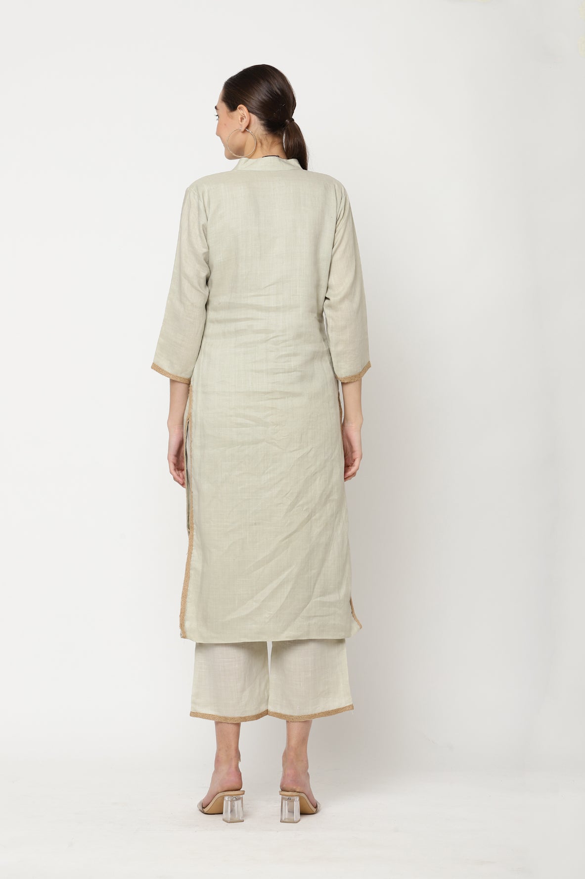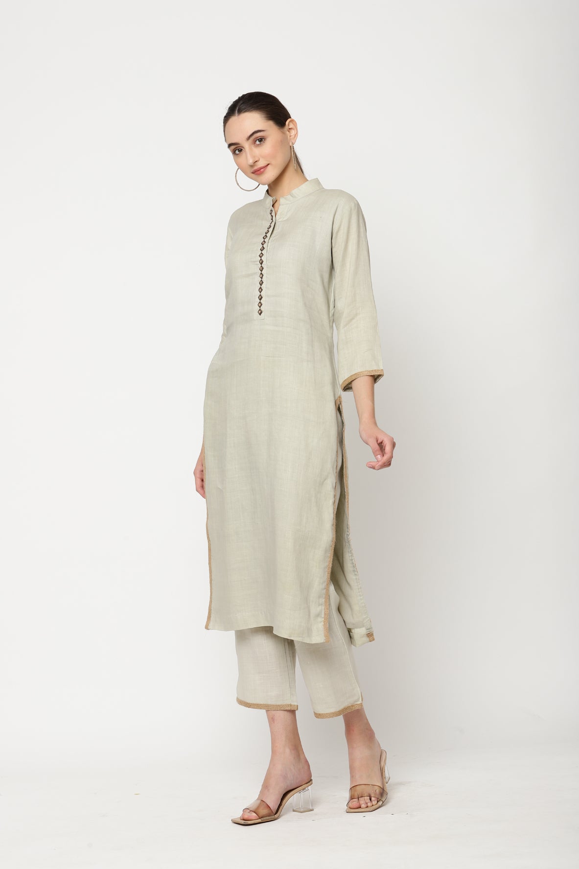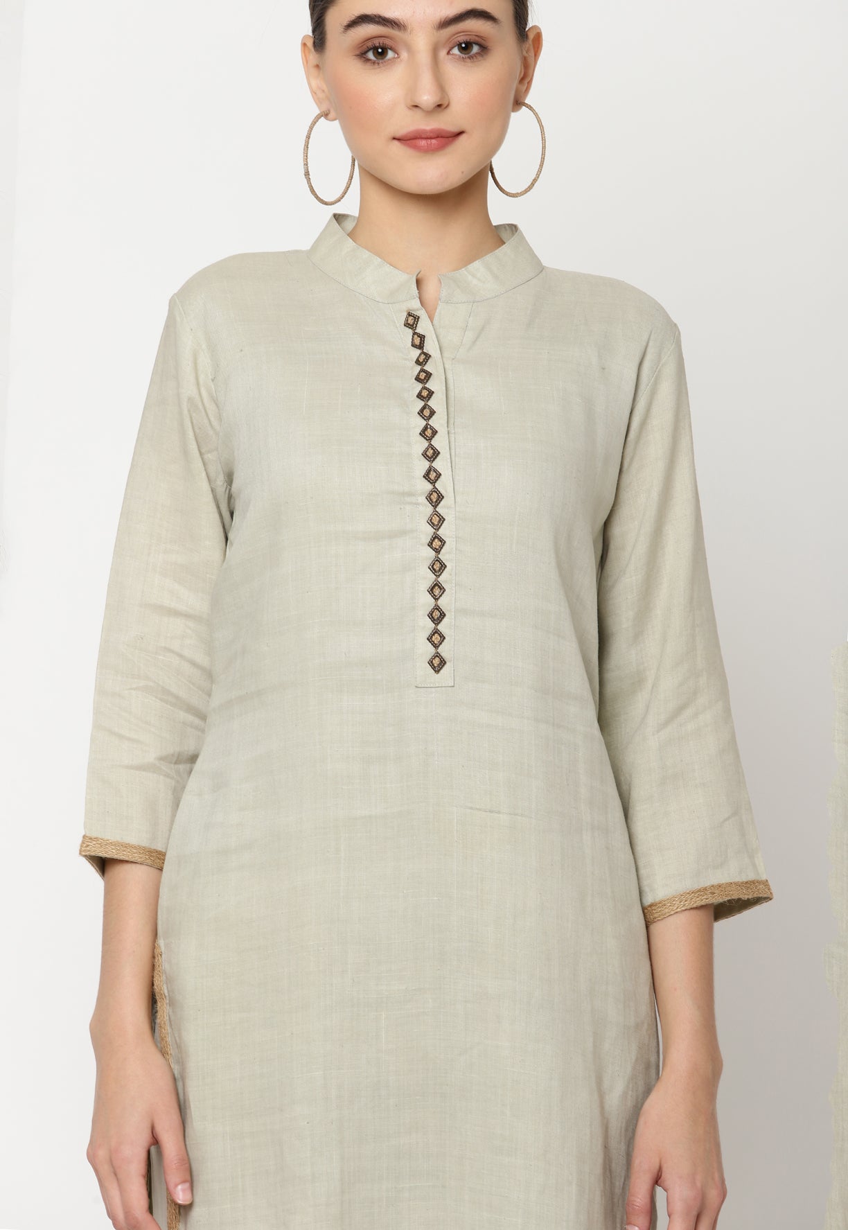 Semillion squirrel grey colour three piece kurta set consisting of cotton linen pants and kurta with jute and metal hand embroidery detailing on the neck. Same colour dupatta in cotton silk with metal embroidery and jute tape border detailing to complete the look.