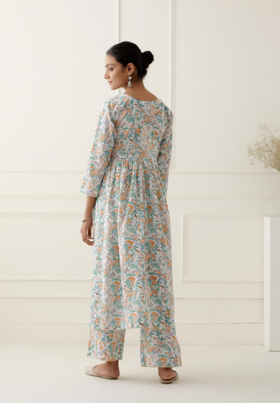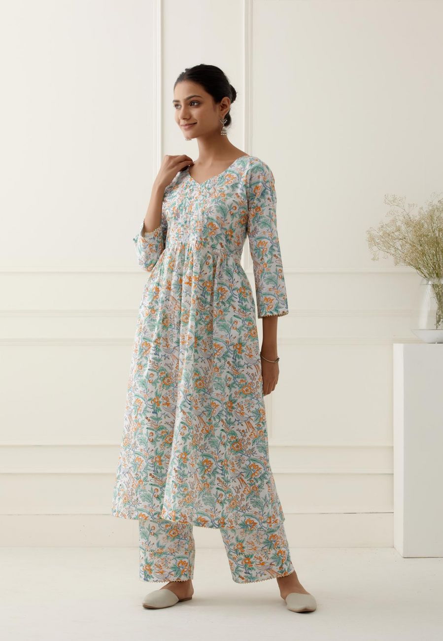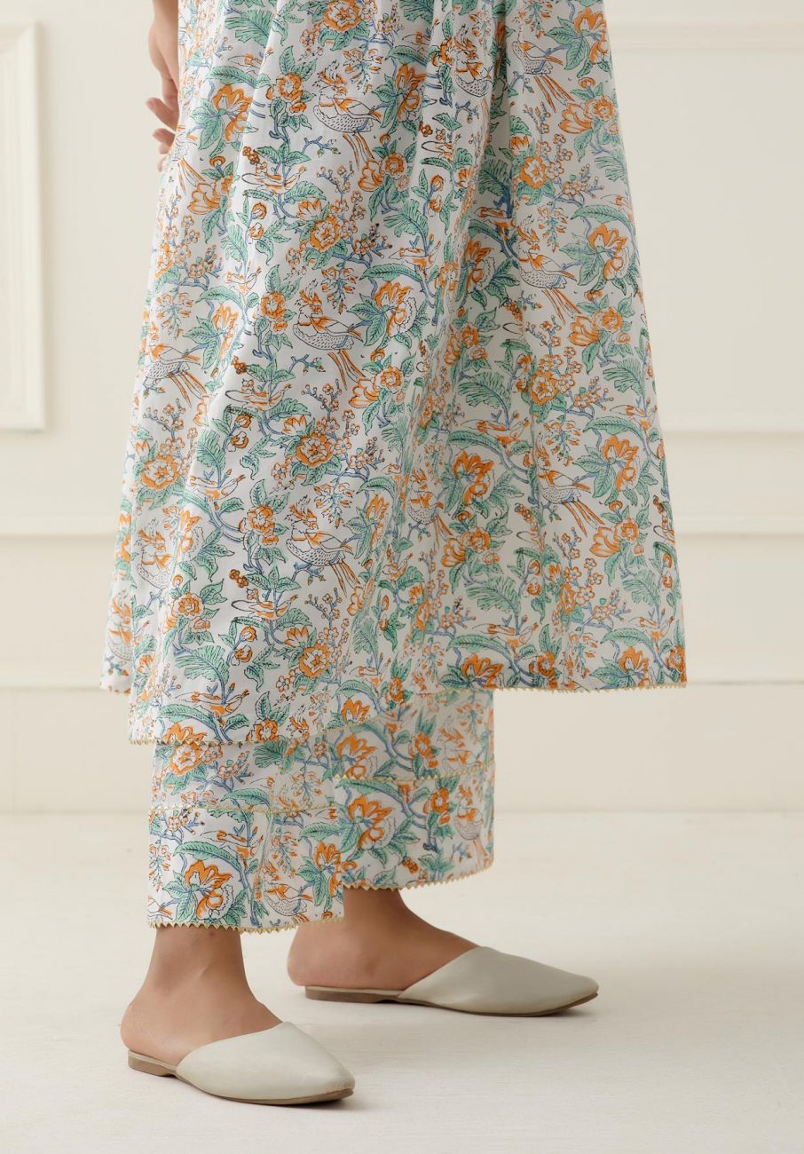 Musal block print three piece kurta set with lace detailing. Featuring hand-block prints, a matching dupatta, and comfortable bottoms.