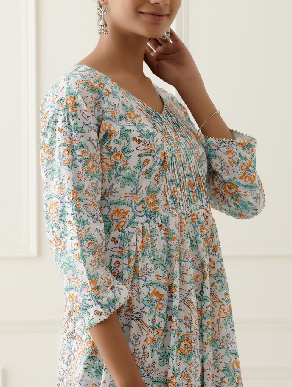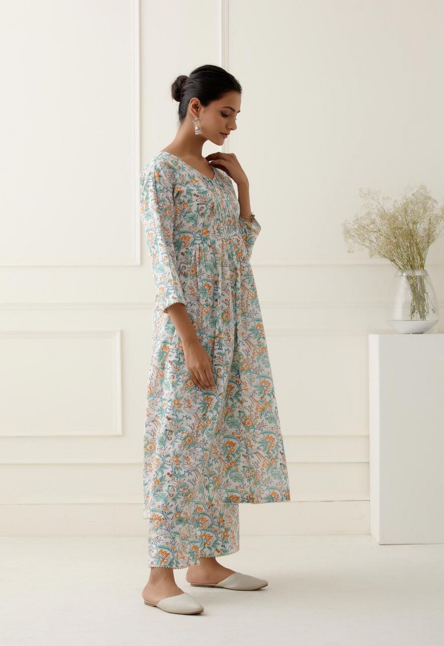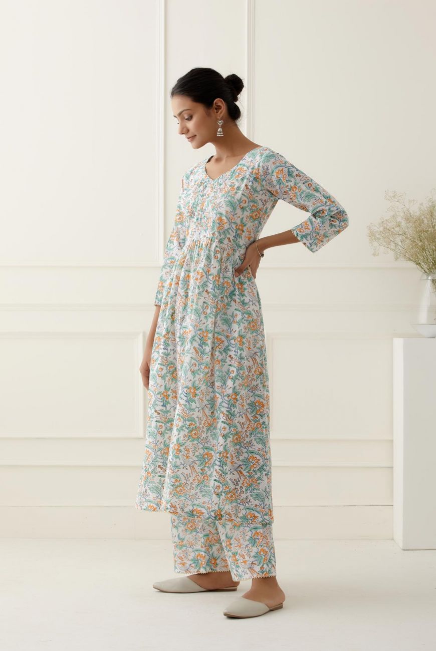 Musal block print three piece kurta set with lace detailing. Featuring hand-block prints, a matching dupatta, and comfortable bottoms.